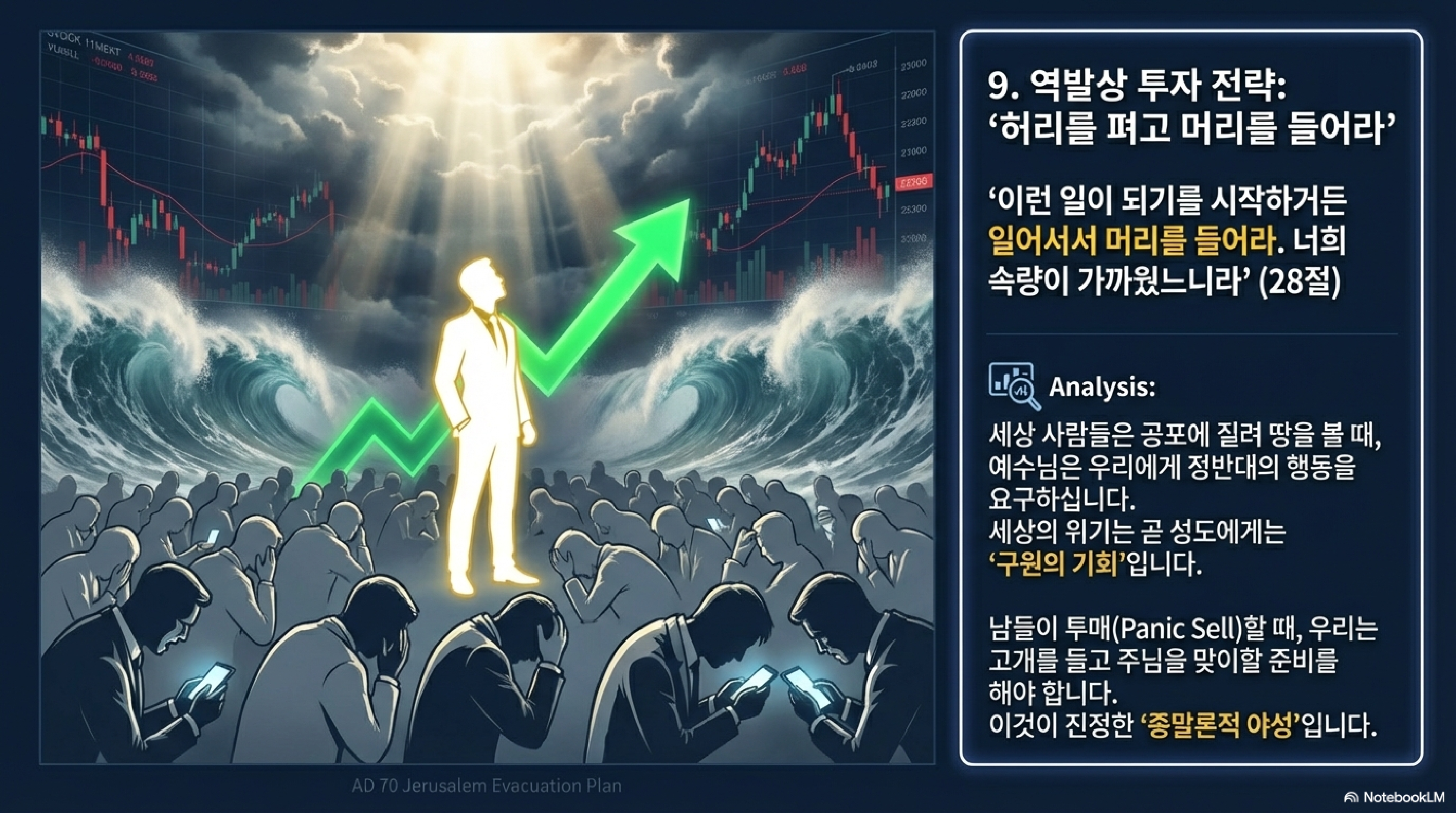 여기서 이방 사람들의 때가 차기까지 예루살렘이 짓밟힐 것이라는 24절 말씀은 거시적 유동성 사이클의 관점에서 볼 필요가 있습니다. 역사의 주권이 인간의 힘이 아니라, 유대인 중심의 시대에서 이방인의 시대로 자본과 은혜의 흐름이 이동하는 거대한 매크로 주기가 있다는 뜻입니다. 지상의 도성이 붕괴하며 발생하는 이 거대한 장세의 변화를 읽어내는 능력이 바로 생존의 핵심입니다.