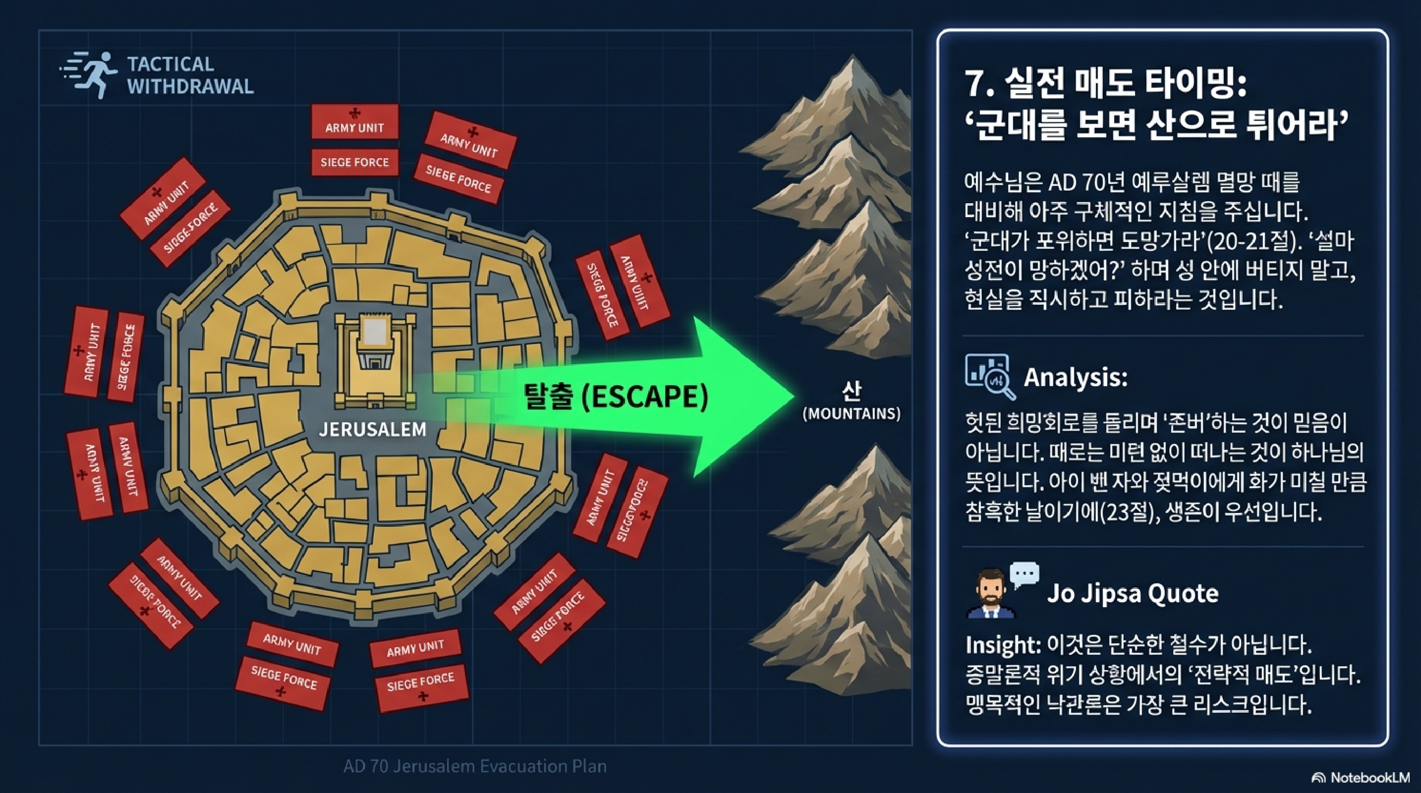 20절부터 24절까지는 좀 더 구체적인 엑시트(Exit) 타이밍을 알려주십니다. 예루살렘이 포위되는 시그널이 오면 뒤도 돌아보지 말고 산으로 도망가라는 겁니다. 평소엔 가장 안전해 보이던 성벽 안이 심판의 날에는 가장 위험한 함정이 됩니다. 특히 아이 밴 여자들과 젖먹이 딸린 여자들에 대한 언급은 시스템이 붕괴할 때 가장 먼저 타격을 입는 사회적 약자들에 대한 깊은 공감을 담고 있습니다.