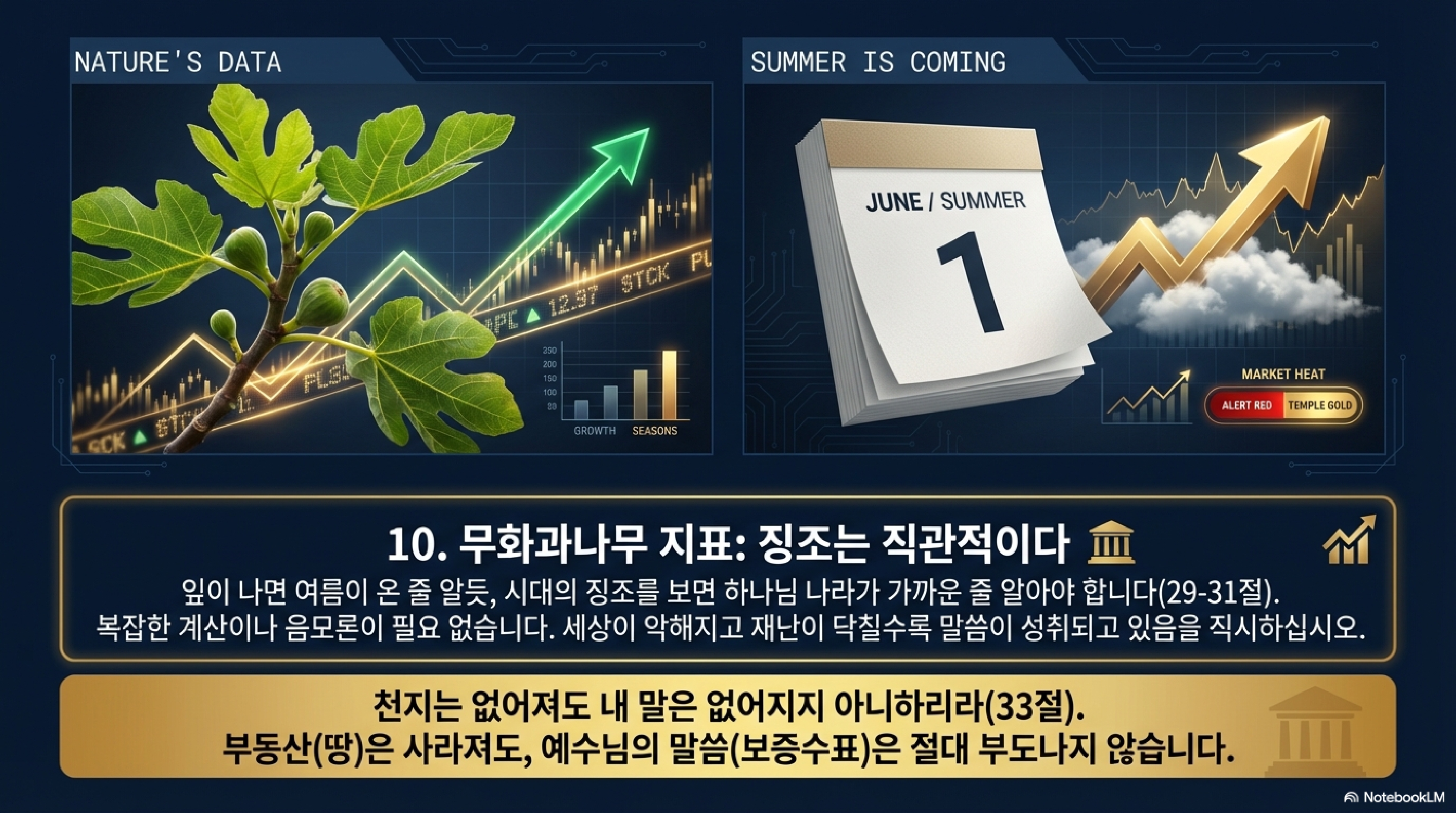 예수님은 무화과나무와 모든 나무의 비유를 통해 섹터 전체의 흐름을 읽는 안목을 강조하십니다. 29절에서 그냥 나무가 아니라 모든 나무를 보라고 하신 점에 주목하십시오. 특정 주식 하나가 아니라 시장 전반의 트렌드를 읽어야 하나님의 나라가 임박했음을 파악할 수 있다는 겁니다. 세상의 가치관은 수시로 바뀌고 하늘과 땅도 없어지겠지만, 예수님의 말씀은 절대로 가치가 하락하지 않는 유일한 안전 자산입니다.