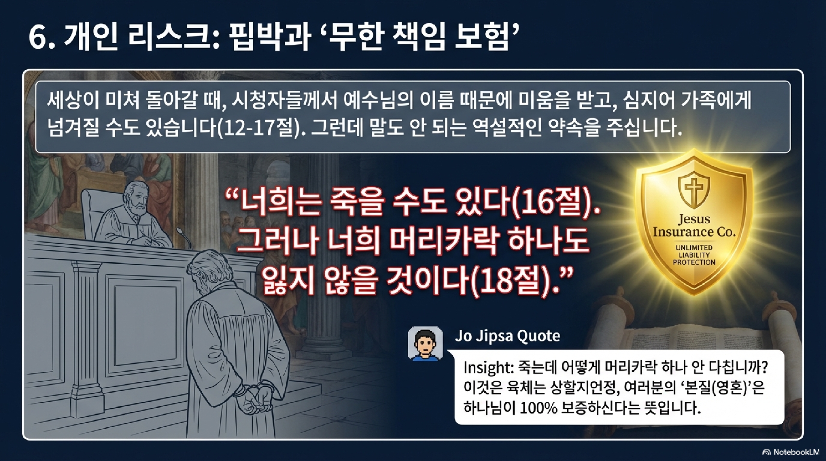 특히 흥미로운 지점은 12절부터 나오는 박해 상황입니다. 예수님은 이 위기를 단순한 고난이 아니라 증언의 기회, 즉 브랜드 마케팅의 정점이라고 분석하십니다. 박해로 인해 왕과 총독들 앞에 서게 될 때, 당황해서 대본을 짤 필요도 없다고 하십니다. 15절에서 약속하시기를, 그 어떤 적대자도 반박할 수 없는 무적의 구변과 지혜, 즉 천상의 알고리즘을 실시간으로 다운로드해주시겠다고 하거든요. 부모와 형제까지 배신하는 막장 드라마 같은 상황에서도 머리카락 하나 잃지 않게 보호하시겠다는 보증서까지 써주십니다. 여기서의 핵심 전략은 인내, 즉 변동성에 일희일비하지 않는 강철 멘탈로 끝까지 버티는 존버입니다. 19절의 인내는 단순한 참기가 아니라, 최후의 승리까지 포지션을 유지하는 고도의 투자 전략입니다.