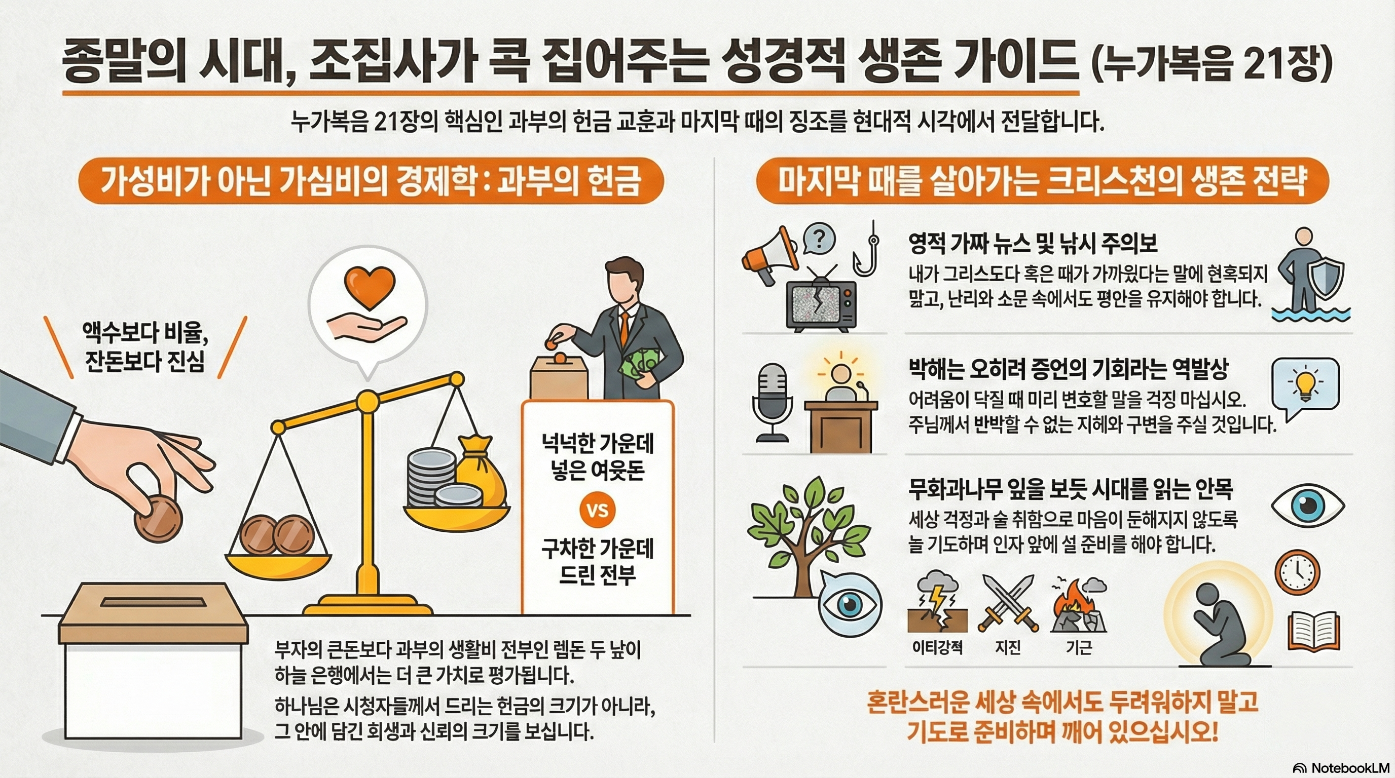 이건 단순한 금액의 크기가 아니라 자산 대비 투입 비중이라는 관점에서 봐야 합니다. 100억 자산가가 100만 원을 헌금하는 건 포트폴리오의 0.01%도 안 되는 잔돈이지만, 전 재산이 1,000원인 사람이 1,000원을 다 넣었다면 이건 100% 풀 매수, 인생을 건 올인 투자입니다. 예수님은 겉으로 보이는 화려한 숫자가 아니라, 리스크를 감수한 진정성과 가용 자산 전부를 던지는 역발상 투자를 보신 겁니다. 그런데 시청자 여러분, 이 위대한 헌금을 받아 챙기던 성전의 미래가 참 골 때립니다.