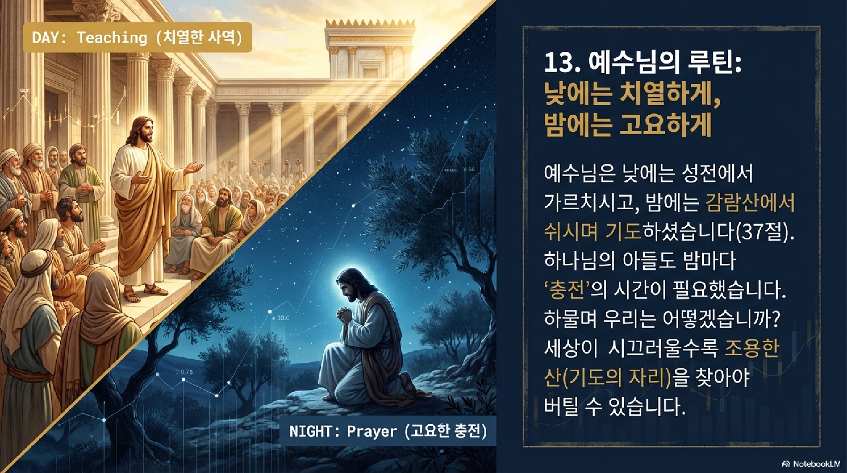 이 노이즈를 제거하는 방법이 바로 기도하며 깨어 있는 것, 즉 데일리 리스크 체크입니다. 37절과 38절을 보면 예수님의 루틴이 나옵니다. 낮에는 성전에서 가르치시고, 밤에는 올리브 산이라 불리는 산으로 나가 기도로 밤을 지내셨습니다. 그리고 백성들은 그 인사이트를 얻으려 이른 아침부터 모여들었죠. 이 완벽한 모닝 루틴과 영적 리듬이 바로 대환난의 시대를 관통하는 최고의 생존 전략입니다.