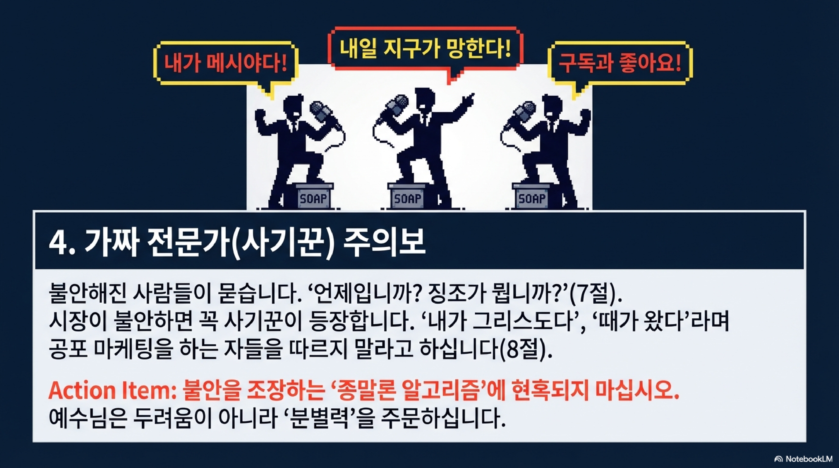 성전이 무너진다는 말에 당황한 제자들이 징조를 묻자, 예수님은 7절부터 19절까지 거의 글로벌 대공황 시나리오급의 리스크를 나열하십니다. 우선 가짜 전문가들을 조심해야 합니다. 시장의 공포를 이용해 내가 메시아다, 때가 왔다고 주장하며 개미 투자자들을 유혹하는 사기꾼들이 득세할 것이라는 경고죠. 전쟁, 기근, 전염병 같은 거시적 변동성이 터질 때 우리는 패닉에 빠지기 쉽지만, 예수님은 두려워하지 말라고 하십니다. 이건 필연적인 시장의 과정일 뿐입니다.