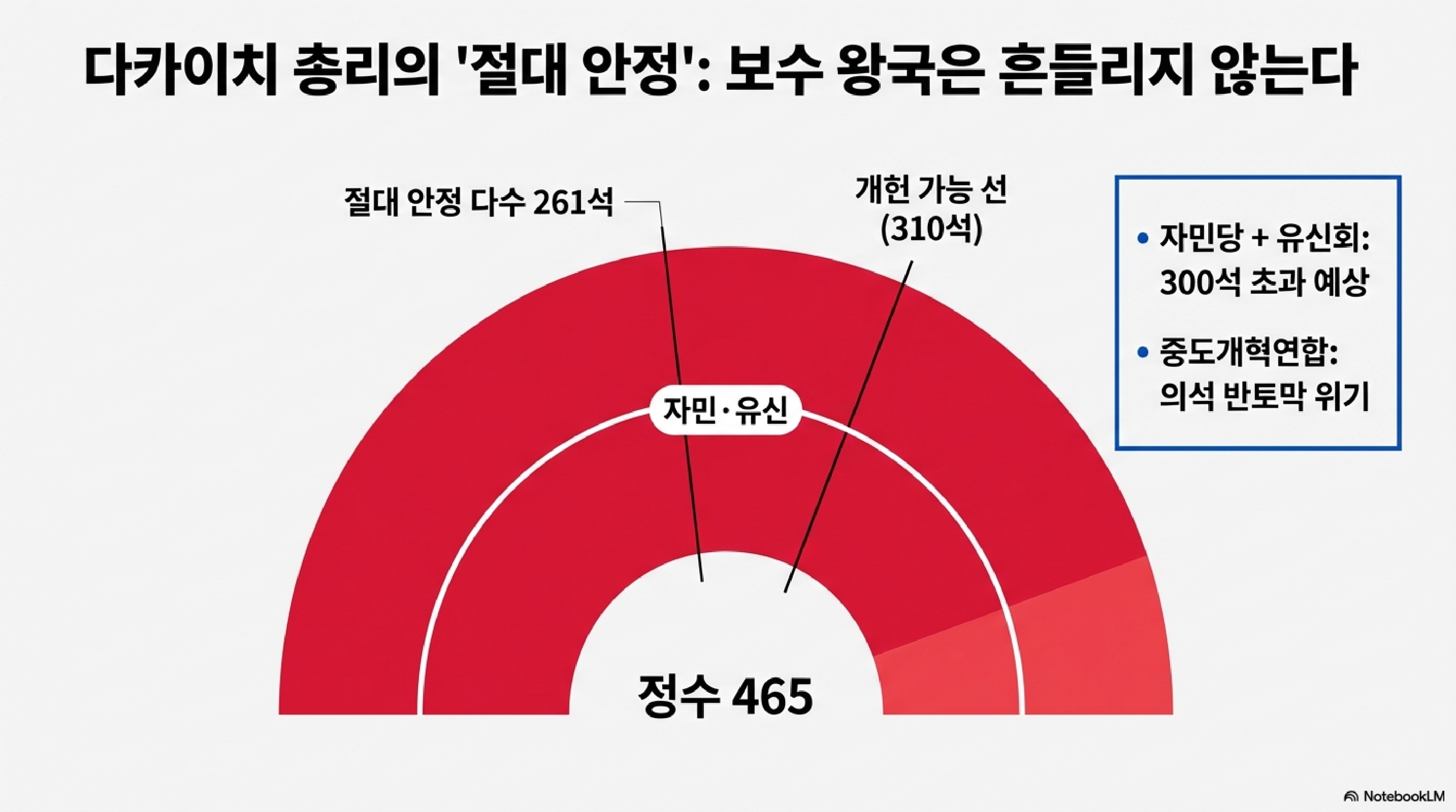 오는 2월 8일 일요일, 일본 중의원 선거 투표일을 앞둔 열도는 그야말로 자민당과 일본유신회의 독무대입니다. 현재 판세를 보면 전체 사백 예순 다섯 개의 의석 중, 두 정당의 연합이 삼백 개를 가뿐히 넘길 기세입니다. 시청자들께서 주목하셔야 할 숫자는 '310'입니다. 개헌 가능 선선인 3분의 2, 즉 삼백 열 개가 넘는 의석을 확보하게 된다면 어떤 일이 벌어질까요?