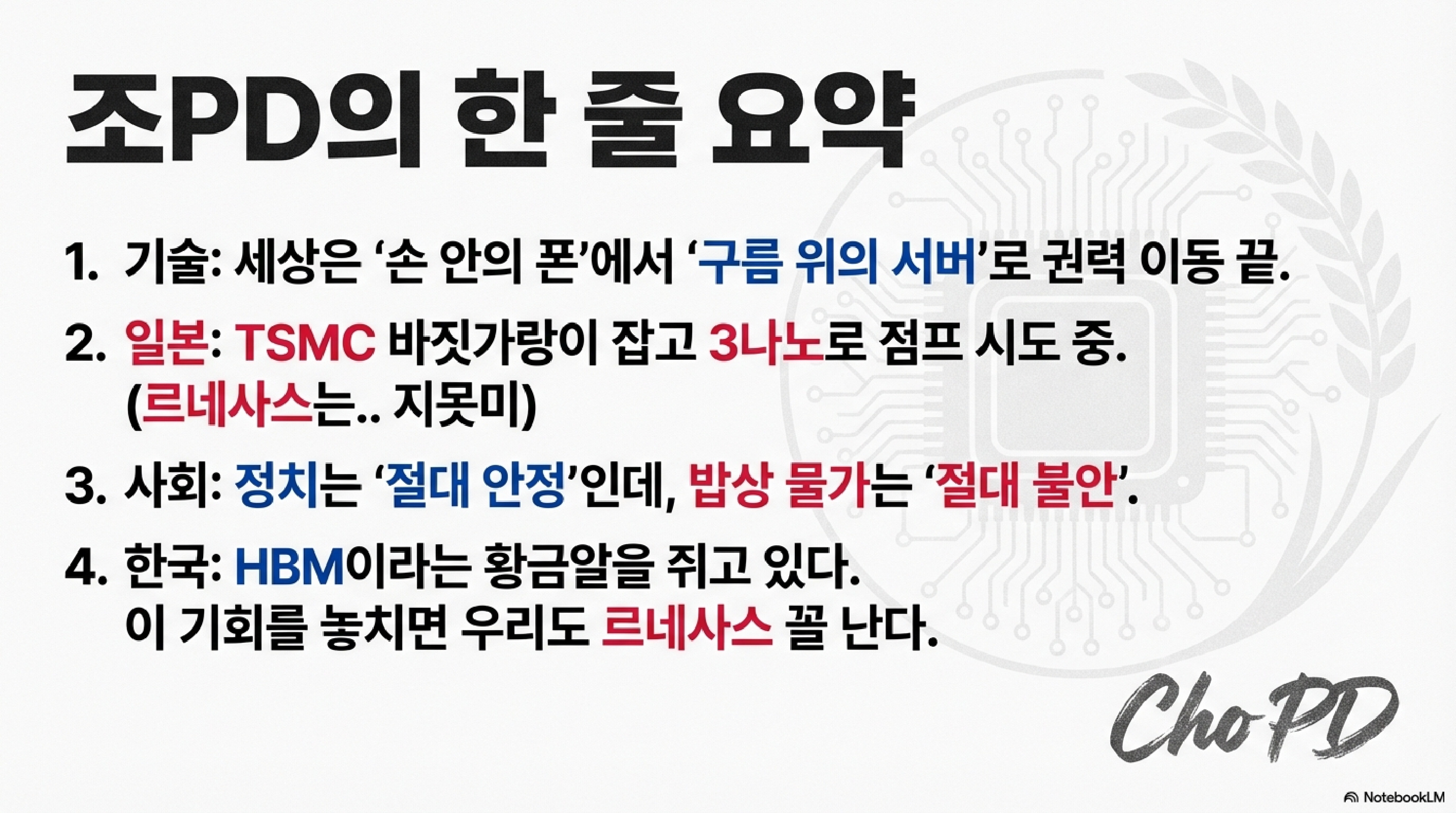 오늘 저희가 살펴볼 주제는 '역대급'이라는 수식어가 아깝지 않습니다. 자민당의 무시무시한 총선 독주, TSMC가 구마모토에서 쏘아 올린 3나노 반도체의 충격, 서민들의 밥상을 위협하는 4,000엔의 쌀값과 108세 보험이라는 기괴한 풍경, 그리고 마지막으로 트럼프와 시진핑이 주고받은 거대한 '대두-대만 빅딜'까지. 이 모든 사건은 한국인들에게 단순한 외신 보도가 아닙니다. 마치 '내 주머니 속 계산기'의 화폐 단위가 바뀌는 것처럼, 우리 경제의 생존과 직결된 생생한 위기 신호거든요.