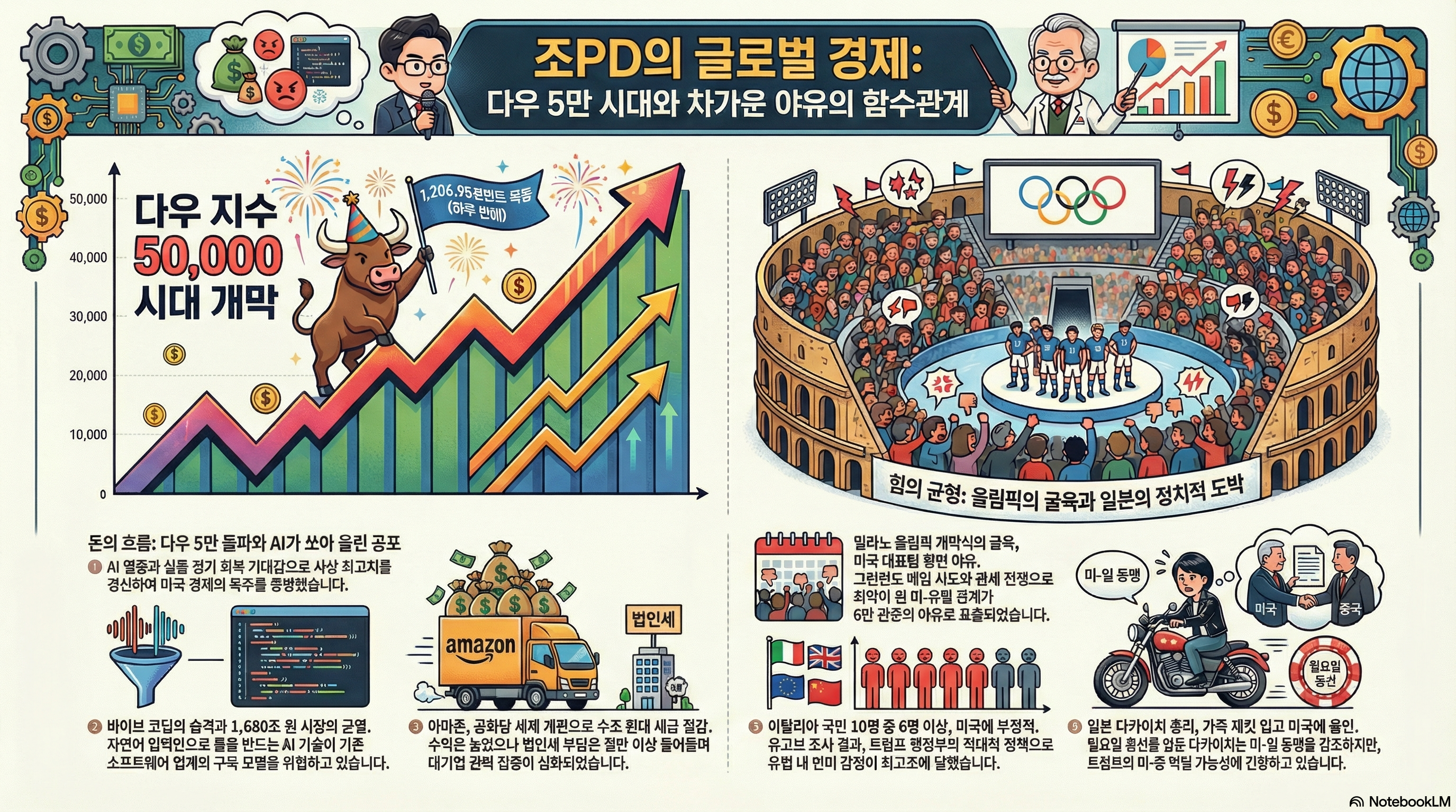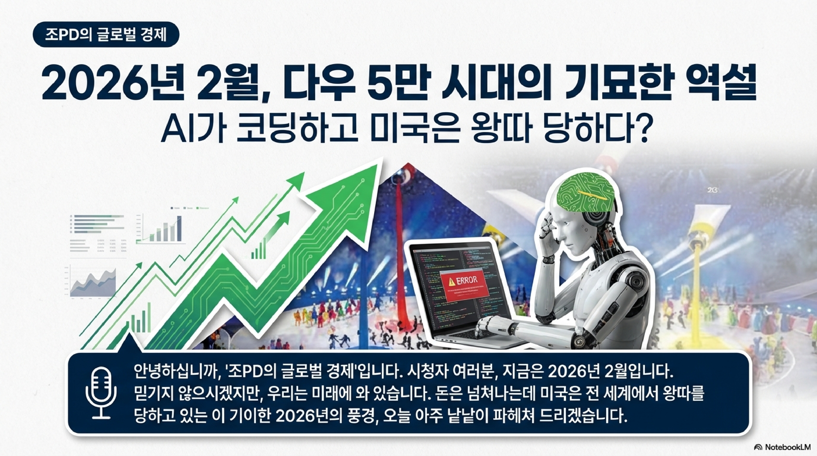 조PD의 글로벌 경제입니다. 시청자들께서도 오늘 아침 계좌 열어보시고 "이게 꿈이야 생시야" 하셨을 겁니다. 2026년 2월 7일 현재, 지구촌은 그야말로 모순 덩어리입니다. 올림픽에서는 야유가 터져 나오고, 정치는 여전히 엉망진창인데, 월스트리트의 전광판은 축제 분위기입니다. 다우 지수가 드디어 '마의 5만 선'을 넘었습니다. 누구는 거품이라고 침을 튀기고, 누구는 실물 경제의 부활이라고 환호합니다. 자, 오늘 이 숫자가 여러분의 지갑에 어떤 의미가 있는지, 그리고 일본에서 들려온 '폭주족 출신' 총리의 770조 원짜리 승부수가 우리에게 어떤 폭풍을 몰고 올지, 행간을 낱낱이 파헤쳐 보겠습니다.