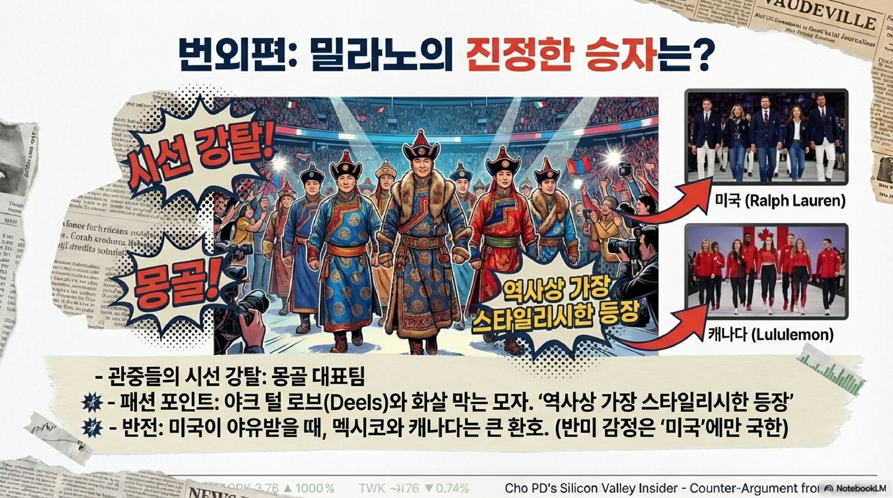 이건 단순한 질투가 아닙니다. 지난달 트럼프 현 대통령이 뜬금없이 그린란드를 인수하겠다고 위협한 게 화근이었습니다. 동맹국 영토를 뺏겠다는 무도한 발언에 이탈리아 국민의 예순 퍼센트 이상이 미국에 등 돌린 결과입니다. 재미있는 건 패션 전쟁입니다. 랄프 로렌이나 아르마니 같은 명품을 제치고 이번 개막식의 주인공은 몽골의 '고욜 캐시미어(Goyol Cashmere)'였습니다. 13세기 전사를 모티브로 한 이 옷들은 전 세계의 찬사를 받았죠. 더 웃픈 건, 이 몽골 기업이 미국으로부터 500만 달러, 약 70억 원을 빌려 이 옷들을 만들었다는 사실입니다. 미국 돈으로 만든 몽골 옷이 미국 옷보다 더 박수를 받은 셈이니, 참 묘한 일입니다.