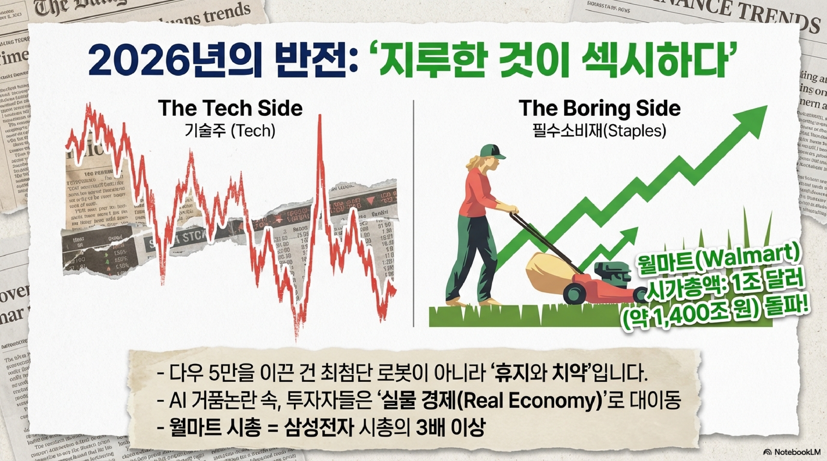 재미있는 건 이번 상승의 주역입니다. 그동안 시장을 주름잡던 소프트웨어나 AI 관련주들이 주춤하는 사이, 이른바 '실물 경제(Real-economy)' 주식들이 전면에 나섰습니다. 월마트가 지난 열두 달 동안 스물여덟 퍼센트나 올랐고, 존슨앤존슨은 쉬여섯 퍼센트, 코카콜라는 스물다섯 퍼센트 상승했습니다. "AI만 먹고 살 순 없다, 결국은 물건 팔고 약 파는 놈들이 강하다"는 걸 시장이 증명한 겁니다. 한국 투자자들에게는 "꿈만 좇지 말고 이익을 내는 실물에 주목하라"는 묵직한 메시지를 던집니다.