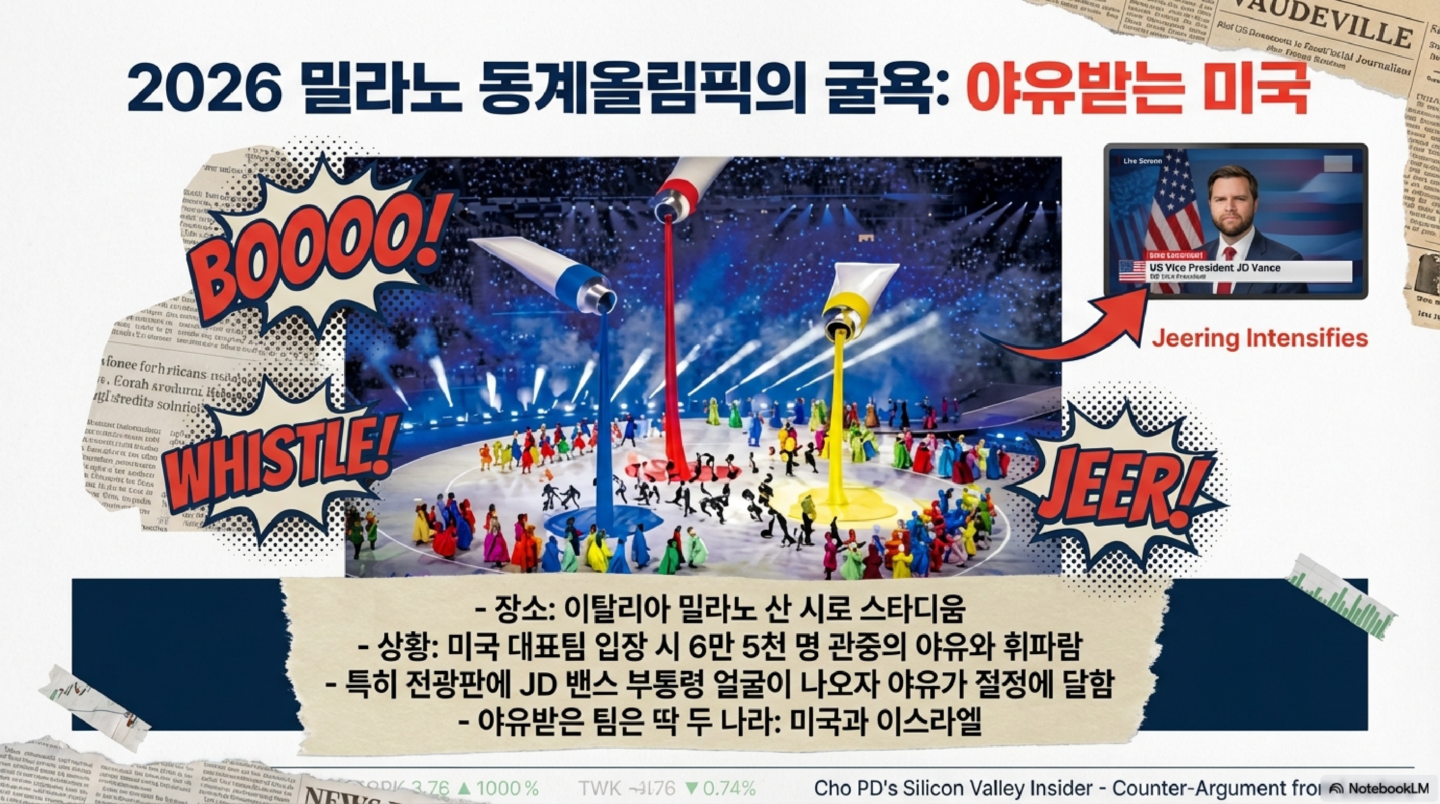 일본은 이렇게 트럼프 대통령과 밀월 관계인데, 유럽에서 열린 올림픽 분위기는 완전히 딴판입니다. 이탈리아에서 밀라노-코르티나 겨울 올림픽이 개막했습니다. 에스프레소 포트가 춤을 추고 마라이어 캐리가 노래하는 화려한 축제였지만, 공기는 차가웠습니다. 미국 대표단이 입장하자 산 시로 스타디움을 가득 채운 예순다섯 명의 천 배에 달하는 관중들이 야유와 휘파람을 쏟아냈습니다. 특히 JD 밴스 부통령의 얼굴이 전광판에 나오자 야유는 절정에 달했죠.