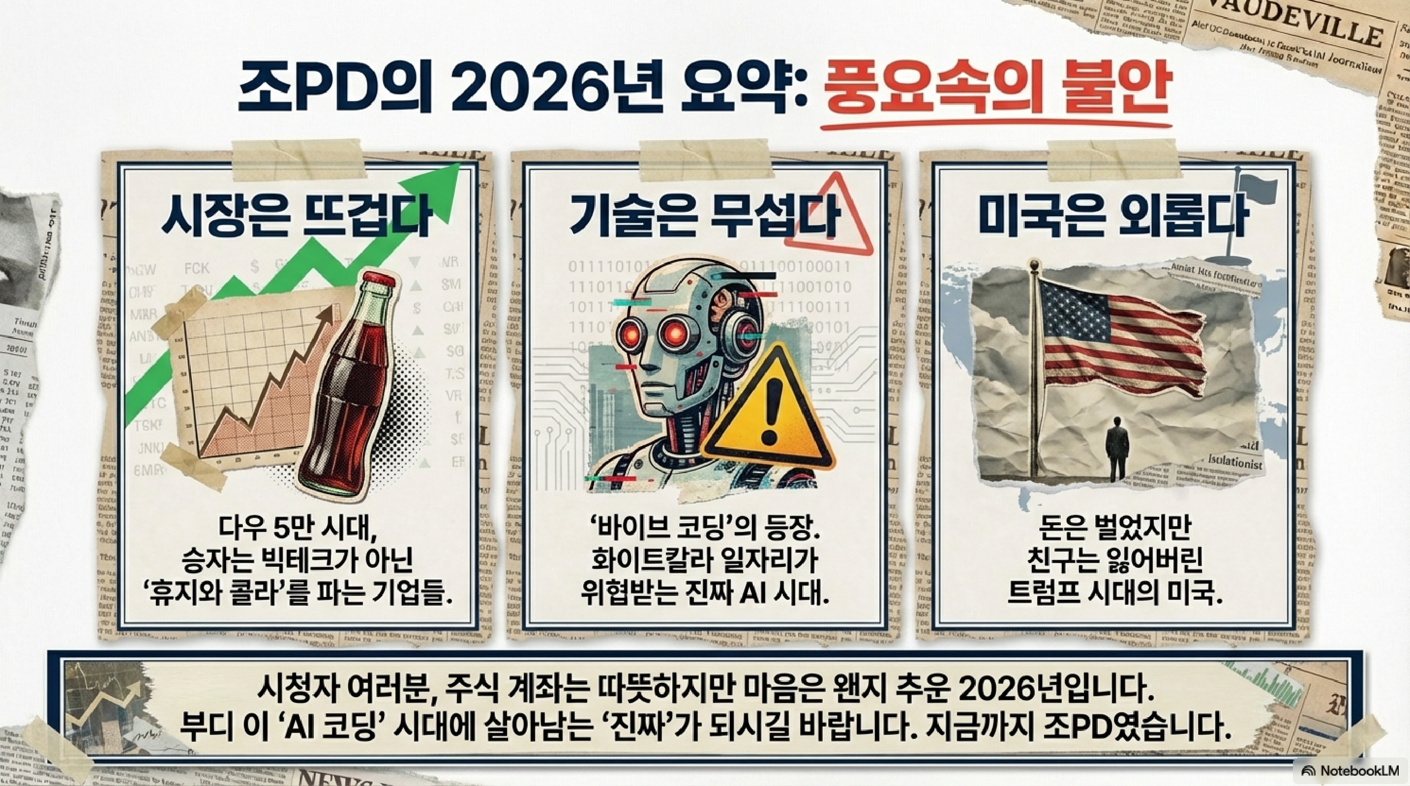 오늘 리포트를 통해 우리가 주목해야 할 세 가지 키워드는 명확합니다. 첫째, 실물 경제의 회복입니다. 거품 섞인 기술주 너머, 진짜 물건을 만드는 기업들의 힘을 보십시오. 둘째, 일본의 베팅입니다. 생존을 위해 미국에 일곱하고도 일흔 조 원을 거는 일본의 모습은 우리에게도 시사하는 바가 큽니다. 우리도 몽골의 캐시미어처럼 우리만의 독보적인 '실물 앵커'를 찾아야 합니다. 셋째, 법적/도덕적 리스크입니다. 아무리 큰 기업도 독점과 도덕성 이슈 앞에서는 한순간에 무너질 수 있습니다. 조PD의 글로벌 경제, 오늘은 여기까지입니다. 여러분의 계좌가 숫자가 아닌 가치로 가득 차길 바랍니다. 감사합니다.