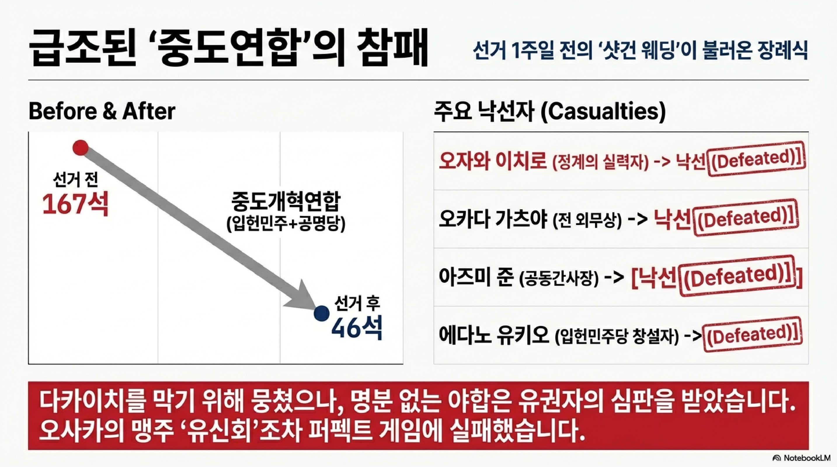 반면 야당인 중도개혁연합은 말 그대로 폭망했습니다. 입헌민주당과 공명당이 합친 이른바 '아쿠마노 갓타이(악마의 합체)' 같은 급조된 연합이 유권자들에게 먹힐 리가 없죠. '정치 대부'라 불리던 오자와 이치로, 에다노 유키오 같은 거물들이 줄줄이 낙선하며 야권은 풍비박산이 났습니다. 그런데 이 아수라장 속에 진짜 재밌는 주인공은 따로 있습니다. 바로 AI 엔지니어 안노가 이끄는 '팀 미라이(Team Mirai)'입니다. 무당층 표심을 17.5%나 흡수하며 무려 8석을 챙겼는데, "세금 깎아줄게"라는 뻔한 소리 대신 "AI로 효율을 높이자"는 형님들의 등장이 일본 정치의 새로운 '꿀잼' 포인트가 되고 있습니다.