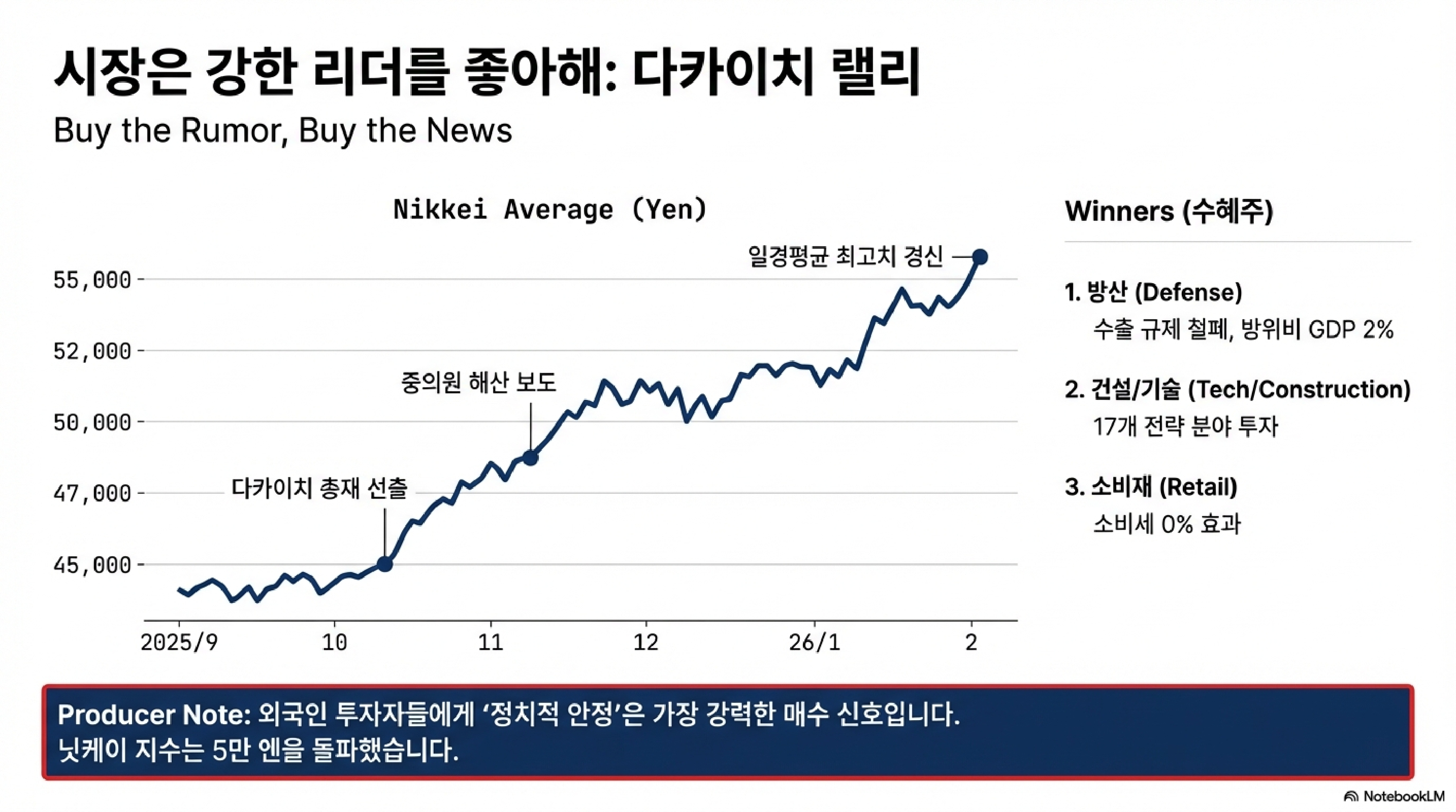 선거 결과가 나오자마자 시장은 즉각적으로 반응했습니다. 닛케이 평균주가는 타카이치 취임 전 대비 19% 폭등하며 54,253엔이라는 역사적인 숫자를 찍었습니다. 시장은 일단 '돈 풀기'와 '강한 리더십'에 취해 샴페인을 터뜨리는 분위기입니다.
