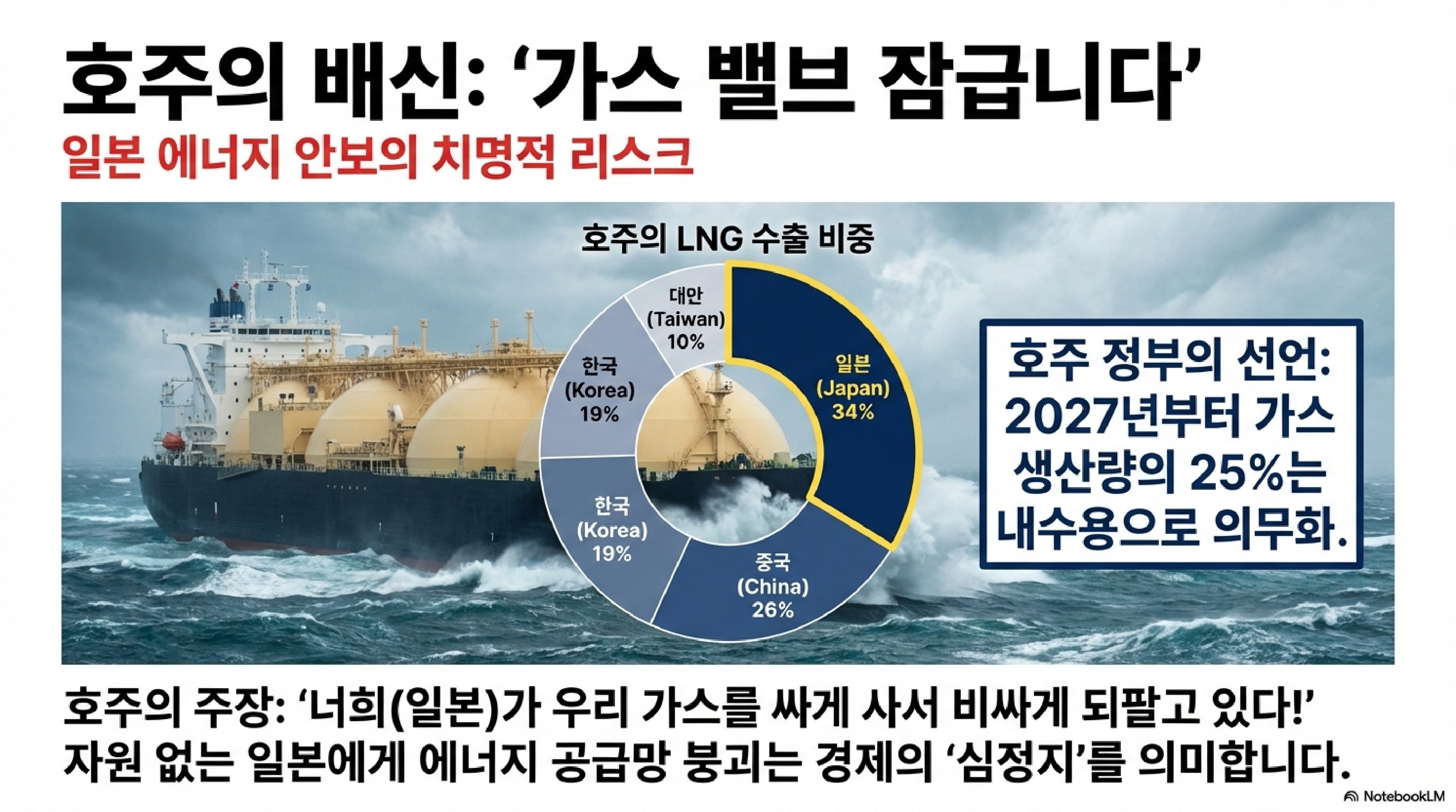 [에너지 안보의 시니컬한 진실] 에너지 쪽을 보면 호주가 LNG 수출 규제(국내 공급 25% 의무화)를 들고 나왔습니다. 일본은 LNG의 4할을 호주에 의존하는데, 지금 호주 의회에서는 "일본 형님들이 우리 가스를 가져다가 제3국에 되팔아(전매) 막대한 이익을 챙긴다"며 비판의 목소리가 높습니다. 이 '전매 논란'이 커질수록 일본 제조 기업들의 에너지 비용은 급등할 것이고, 감세로 얻은 이익은 전기료로 다 나갈 판입니다.