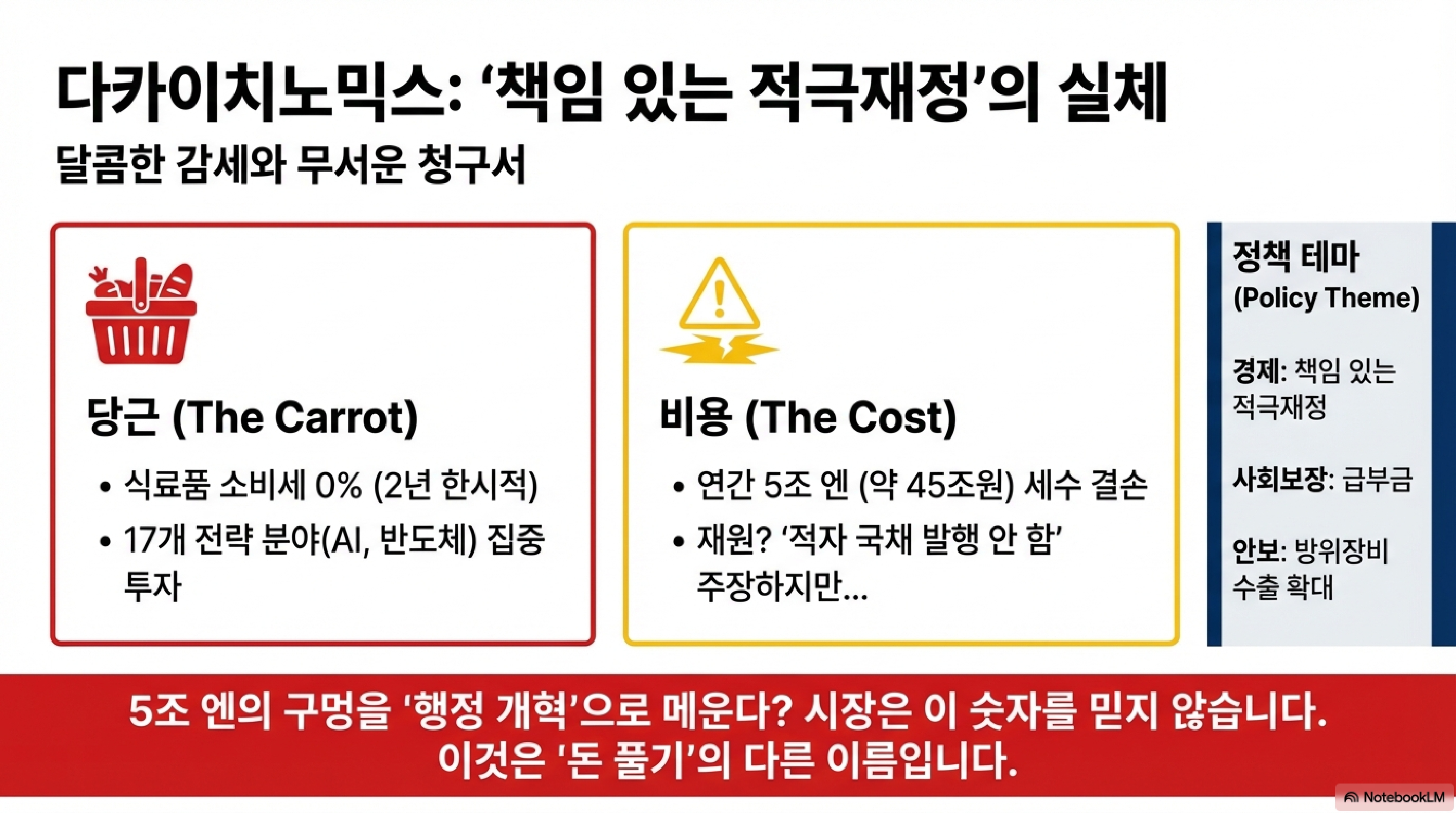 이렇게 압도적인 힘을 얻은 타카이치 총리가 승리 선언 직후 꺼내든 카드는 무엇일까요? 시장을 경악하게 만든 '재정 폭탄'의 실체를 파헤쳐 보겠습니다.