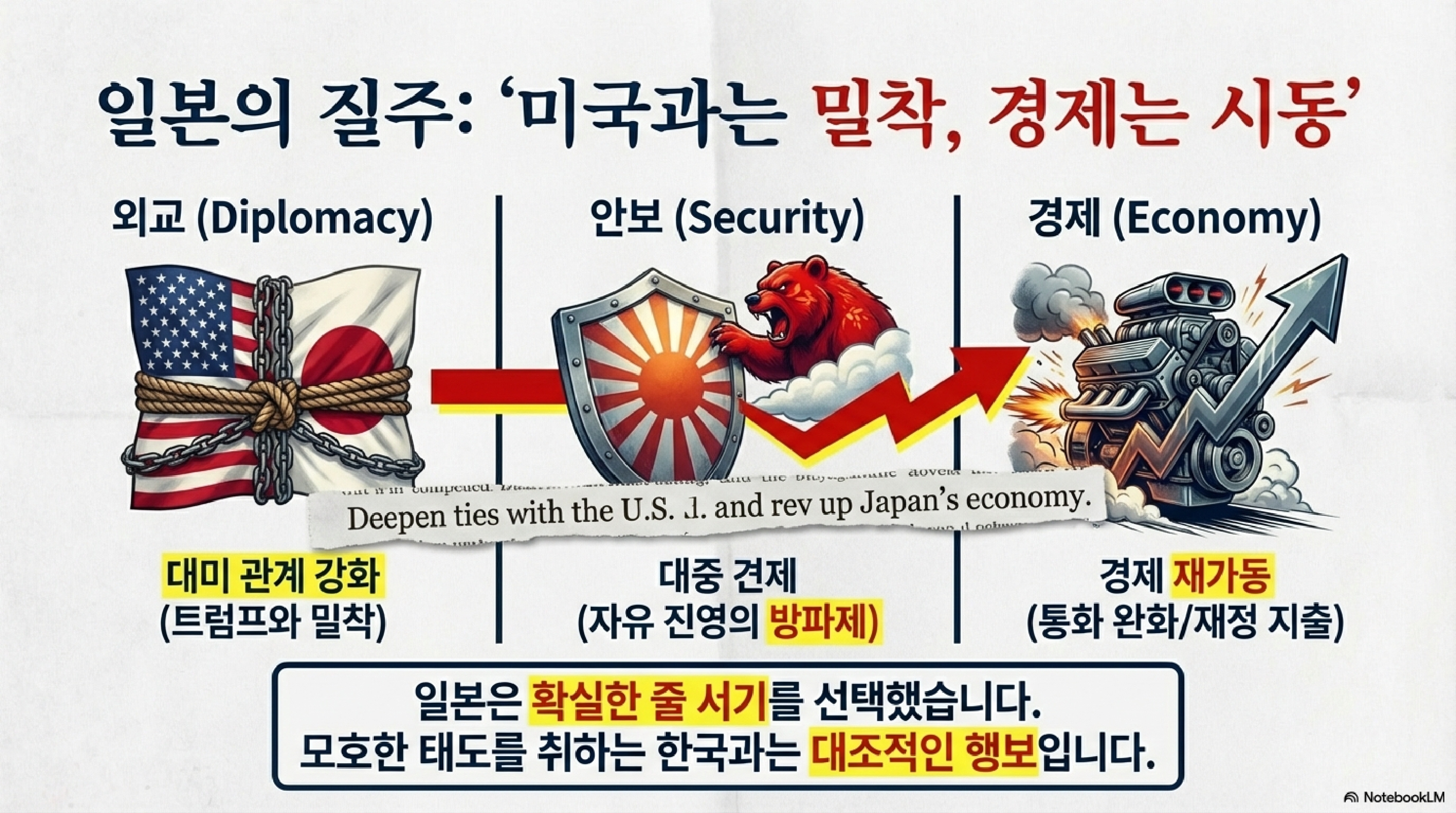 그녀의 칼날은 이제 경제와 외교를 향합니다. 다카이치의 슬로건은 "일본 경제 재가동(Rev up)"입니다. 돈을 무지막지하게 풀어서 경제를 돌리겠다는 건데, 여기에 '친미(Pro-U.S.)' 노선이 아주 강력하게 박혀 있습니다. 일본을 미국의 '대체 불가능한 아시아 파트너'로 만들겠다는 거죠. 트럼프 대통령과는 벌써 '새로운 황금기' 운운하며 찰떡궁합을 과시하고 있습니다.