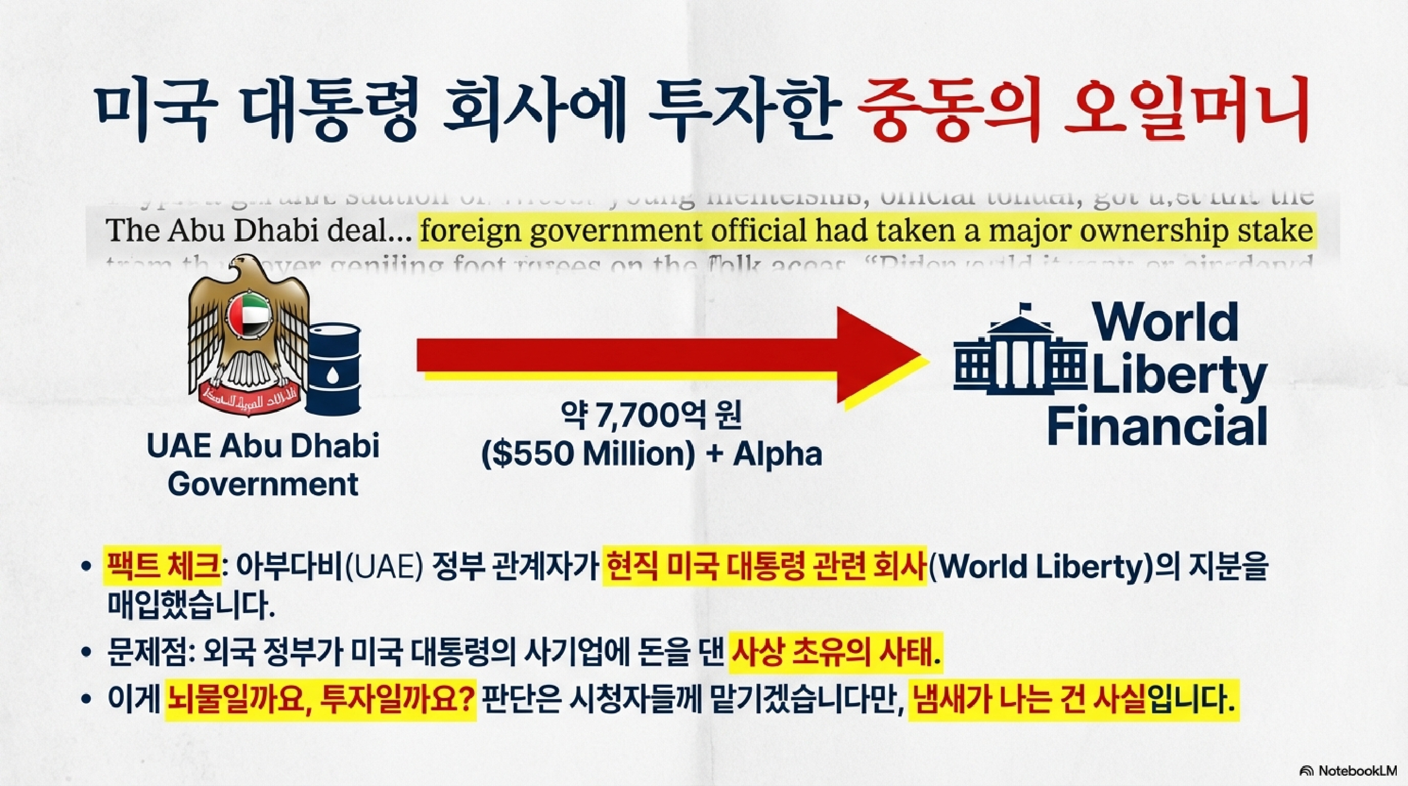 - 사면권은 마케팅 도구인가: 아부다비 왕실 측과 5억 달러(약 7,000억 원) 규모의 비밀 거래가 성사된 시점이 아주 절묘합니다. 바로 바이낸스 창립자 창펑 자오(CZ)가 사면받은 시기와 겹치거든요. 대통령의 '사면권'이 가문의 코인 사업을 위한 거대 마케팅 도구로 쓰인 것 아니냐는 시니컬한 의문이 나올 수밖에 없습니다.