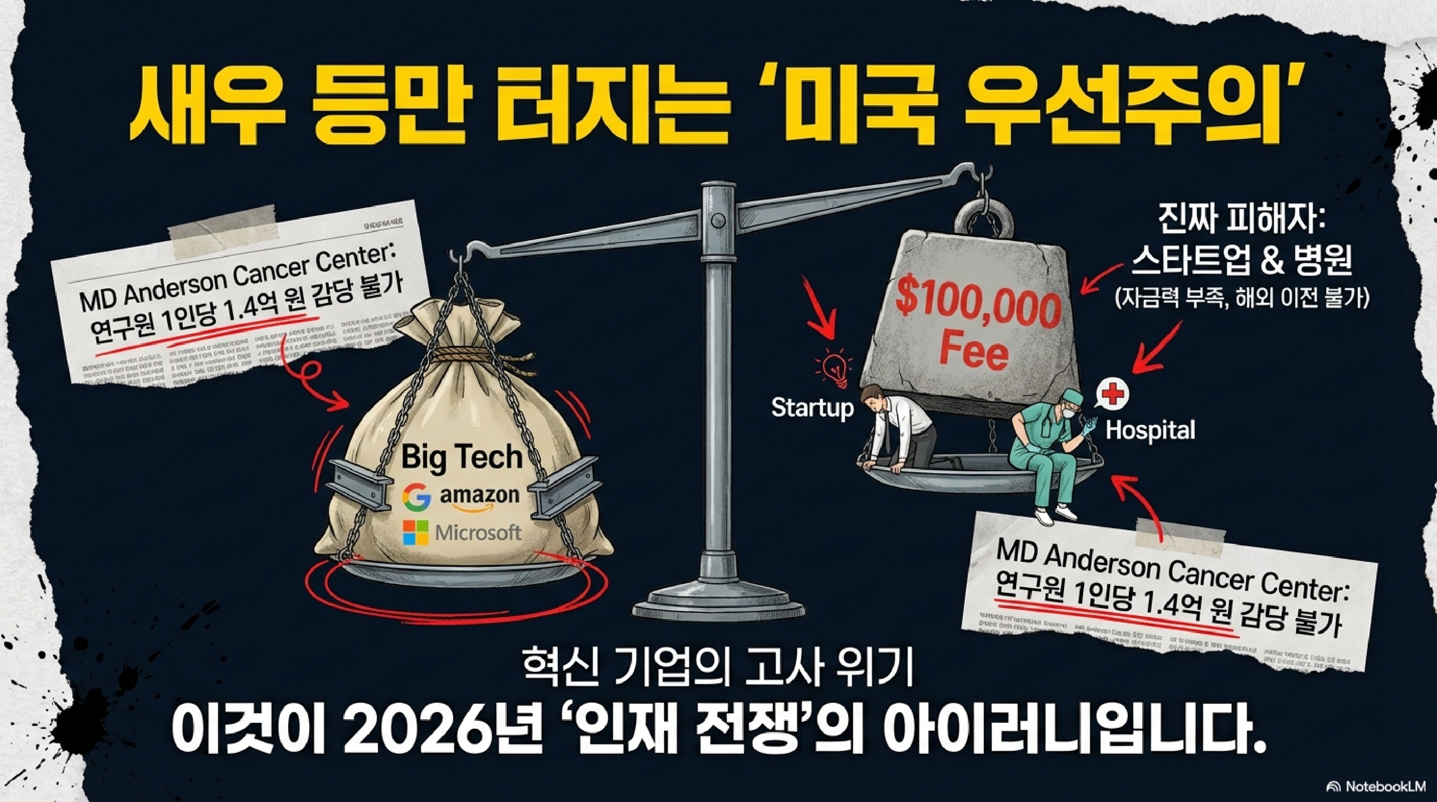 - 스타트업의 절규: 반면 직원 20명의 헬스케어 스타트업 '리미디(Rimidi)' 같은 곳은 사형 선고를 받은 격입니다. 인재 한 명 뽑는 데 1.4억 원을 태울 여력이 어디 있겠습니까? 로저스 백악관 대변인은 "시스템 스패밍(허위 신청) 방지"라고 우기지만, 실상은 **'고급 인재 입장권을 대기업에만 프리미엄으로 팔겠다'**는 소리나 다름없습니다.