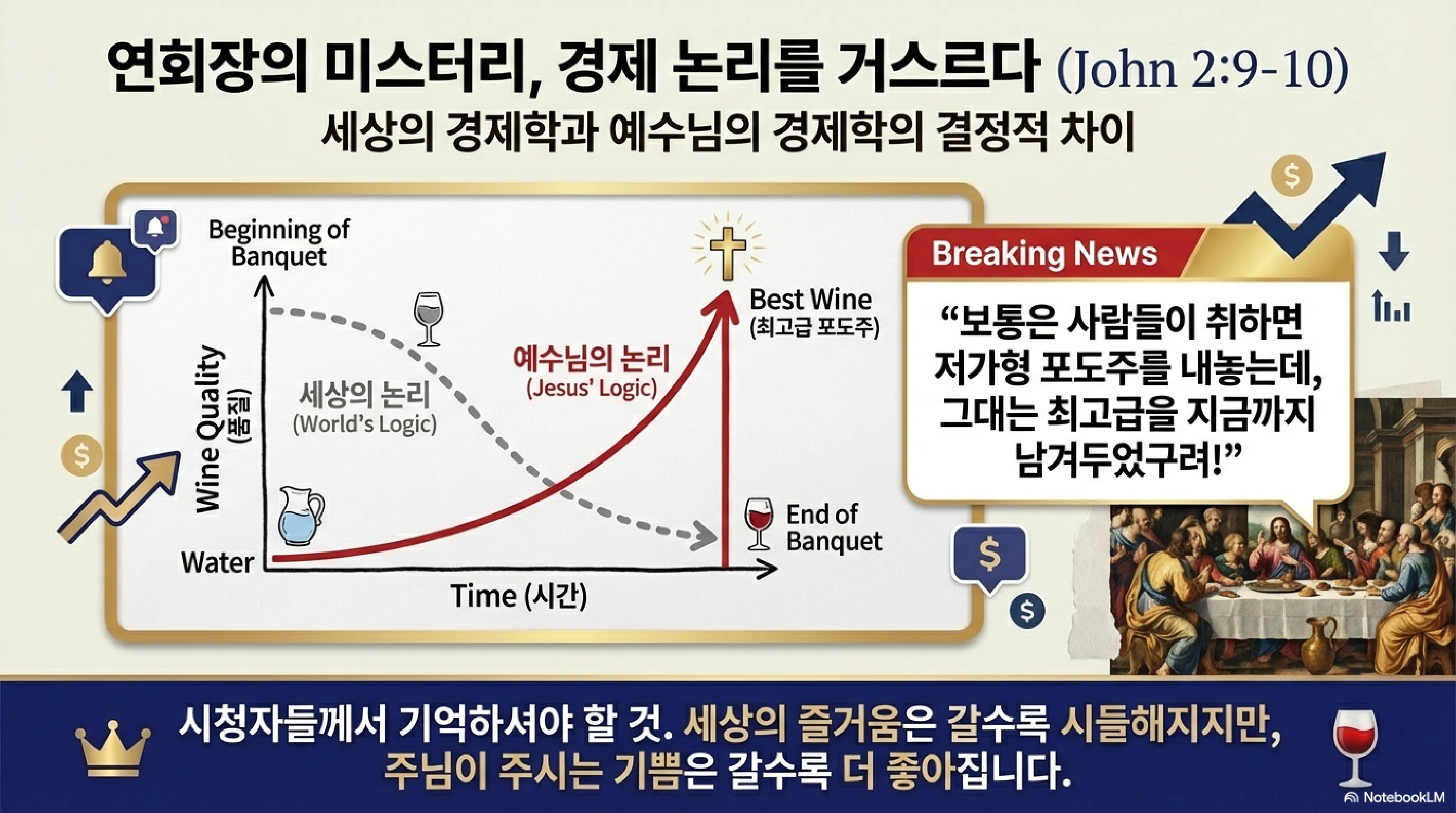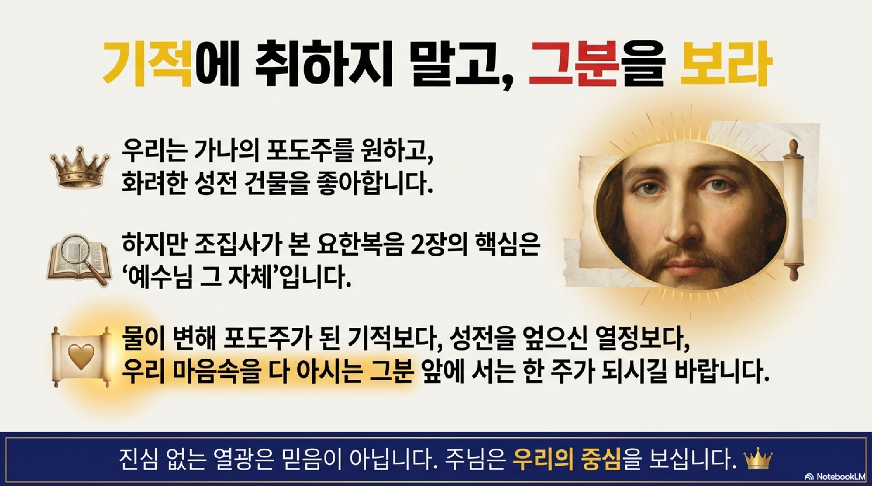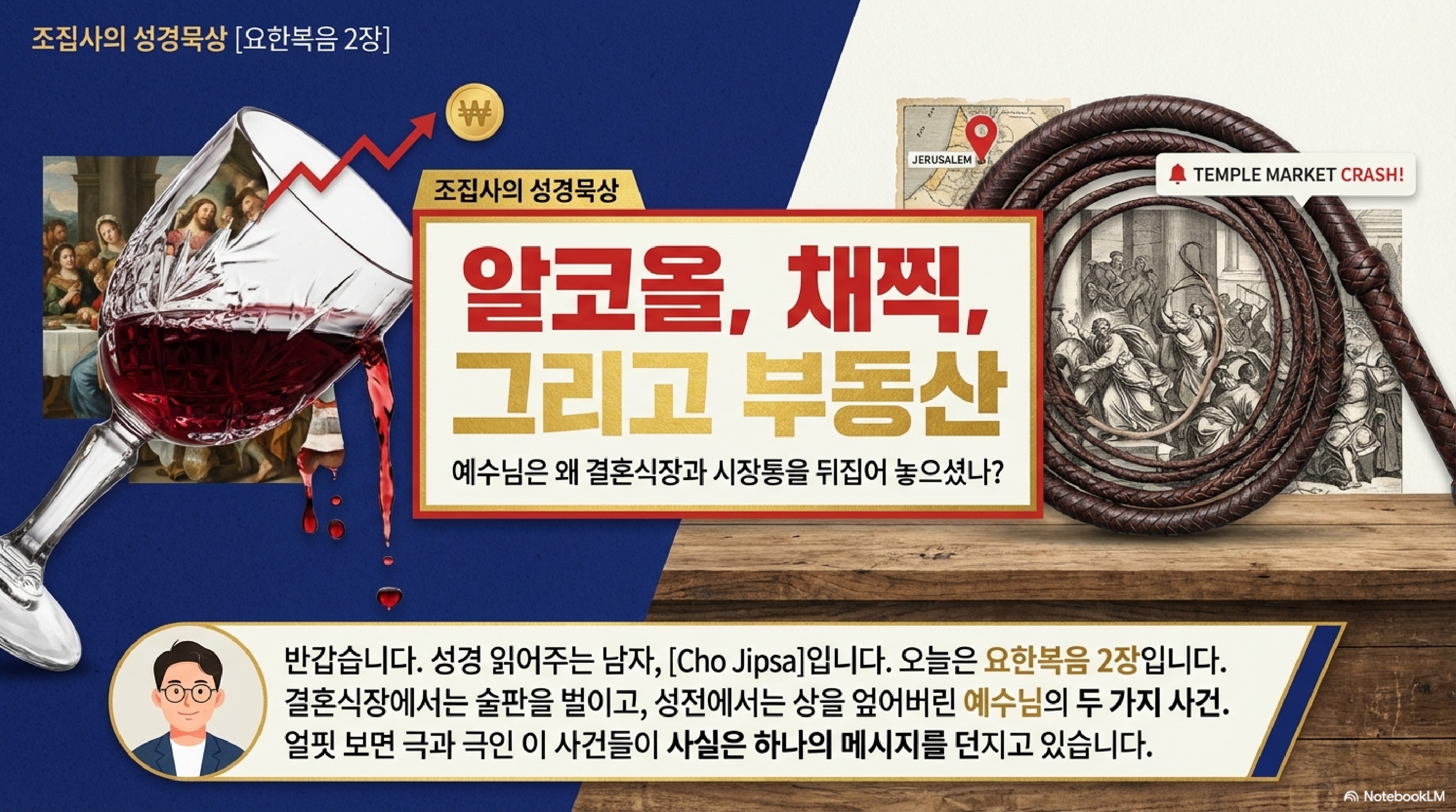시청자들께서도 이 지점을 고민해 보셔야 합니다. 우리가 지금 쫓고 있는 게 잔칫집의 공짜 술이나 성전의 이권 같은 눈앞의 표적인지, 아니면 그 본질인 예수님 본체인지 말입니다. 겉모습은 화려하지만 속은 장사치들로 가득한 46년 된 성전처럼 살고 있지는 않나요? 인간의 마음을 꿰뚫어 보시는 그분 앞에서 숨길 수 있는 데이터는 없습니다. 혹시 지금 내 인생의 포도주가 떨어졌다고 영끌해서 빚내지 마시고, 일단 내실이라는 항아리에 물부터 가득 채워보시길 권면하며 오늘 방송 마칩니다.