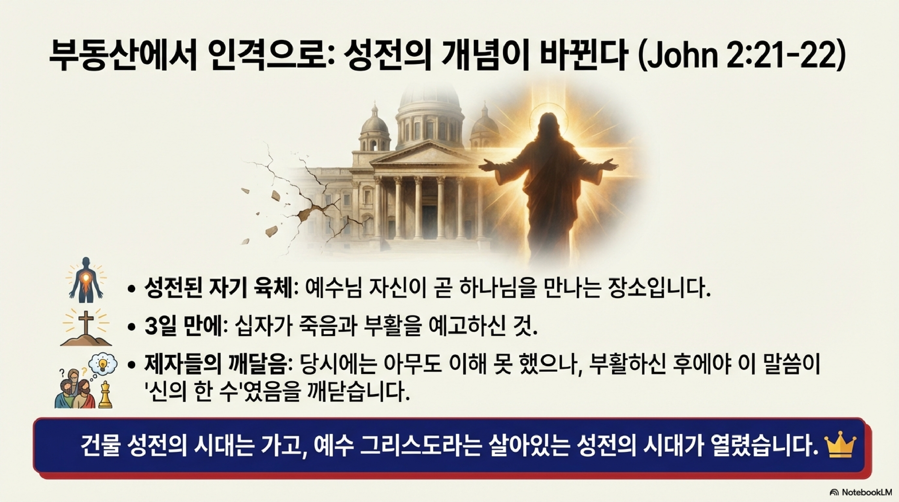 유대인들이 이 파격적인 행보에 증거를 요구하자, 예수님은 아주 시니컬한 솔루션을 던지십니다. 이 성전을 허물어라, 내가 사흘 만에 다시 세우겠다. 사람들은 비웃었죠. 마흔여섯 해 동안 공들여 지은, 감가상각도 안 끝난 거대한 물리적 자산을 어떻게 3일 만에 재건축하느냐는 겁니다. 하지만 예수님이 말씀하신 성전은 낡고 무거운 콘크리트 건물이 아니었습니다. 본인의 몸, 즉 부활을 통한 애자일하고 영원한 생명의 가치를 정의하신 겁니다. 46년 된 구식 하드웨어와 3일 만에 구축될 혁신적인 소프트웨어의 대결, 결국 예수님은 건물의 외벽이 아니라 그 안을 채운 본질을 보셨던 겁니다.