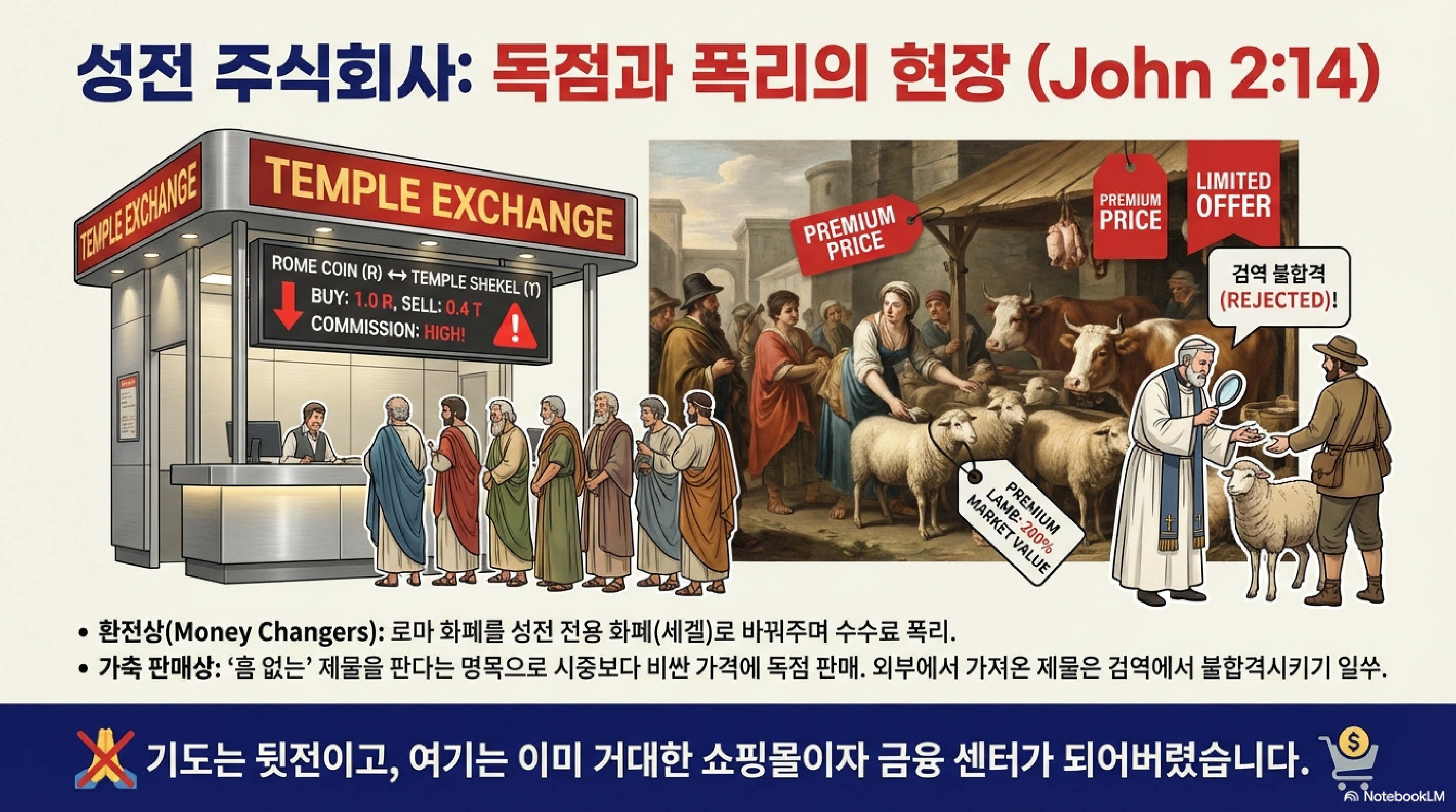 두 번째 현장은 예루살렘 성전입니다. 유월절 대목을 맞이한 성전 뜰은 소, 양, 비둘기 파는 상인들과 환전상들이 꽉 잡고 있었습니다. 제물을 독점 공급하면서 높은 수수료를 챙기고, 환전 차익까지 남기는 아주 견고한 독점 비즈니스 모델이 구축된 상태였죠. 예수님은 여기서 노끈으로 채찍을 만들어 시장에 직접 개입하십니다. 상을 뒤엎고 돈을 쏟아버리시는 강제 퇴거 조치를 단행하신 겁니다. 내 아버지의 집을 장사하는 집으로 만들지 말라! 제자들은 여기서 주님의 집을 생각하는 열정이 나를 삼킬 것이라는 말씀을 떠올립니다. 창업자가 브랜드 아이덴티티를 지키기 위해 직접 구조조정에 나선 셈입니다.