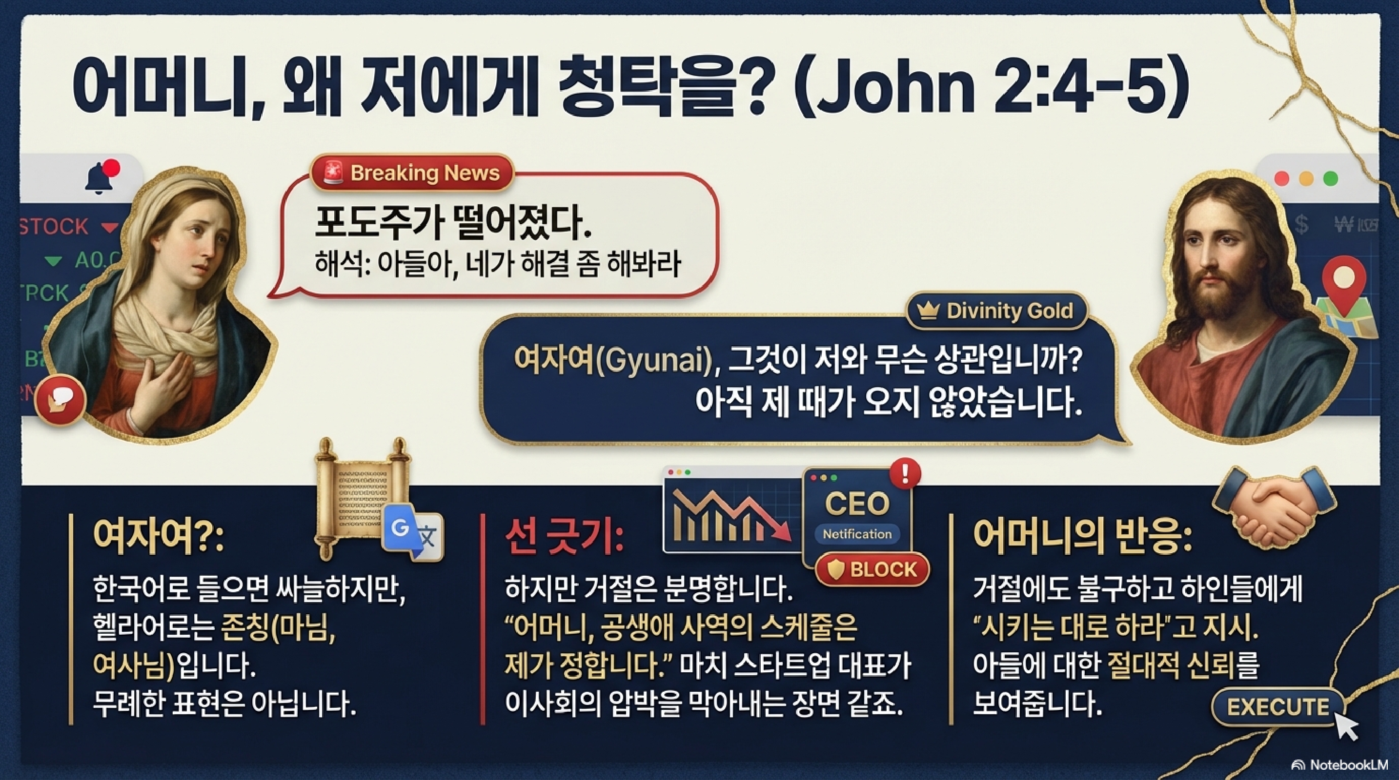 첫 번째 사건은 갈릴리 가나의 한 결혼식장에서 터진 포도주 품절 사태입니다. 잔칫집에서 술이 끊겼다? 이건 요즘으로 치면 스타트업이 서비스 런칭 당일 펀딩 자금이 바닥난 것과 다름없는 파산 위기입니다. 이때 어머니 마리아가 도움을 요청하니까 예수님 반응이 좀 까칠합니다. 여자여, 그것이 나와 무슨 상관입니까? 내 때가 아직 오지 않았습니다. 선을 확 그어버리시죠. 슈카식으로 해석하자면, 공식 로드맵에 없는 일정이라 리소스 투입 못 하겠다는 단호한 거절입니다.