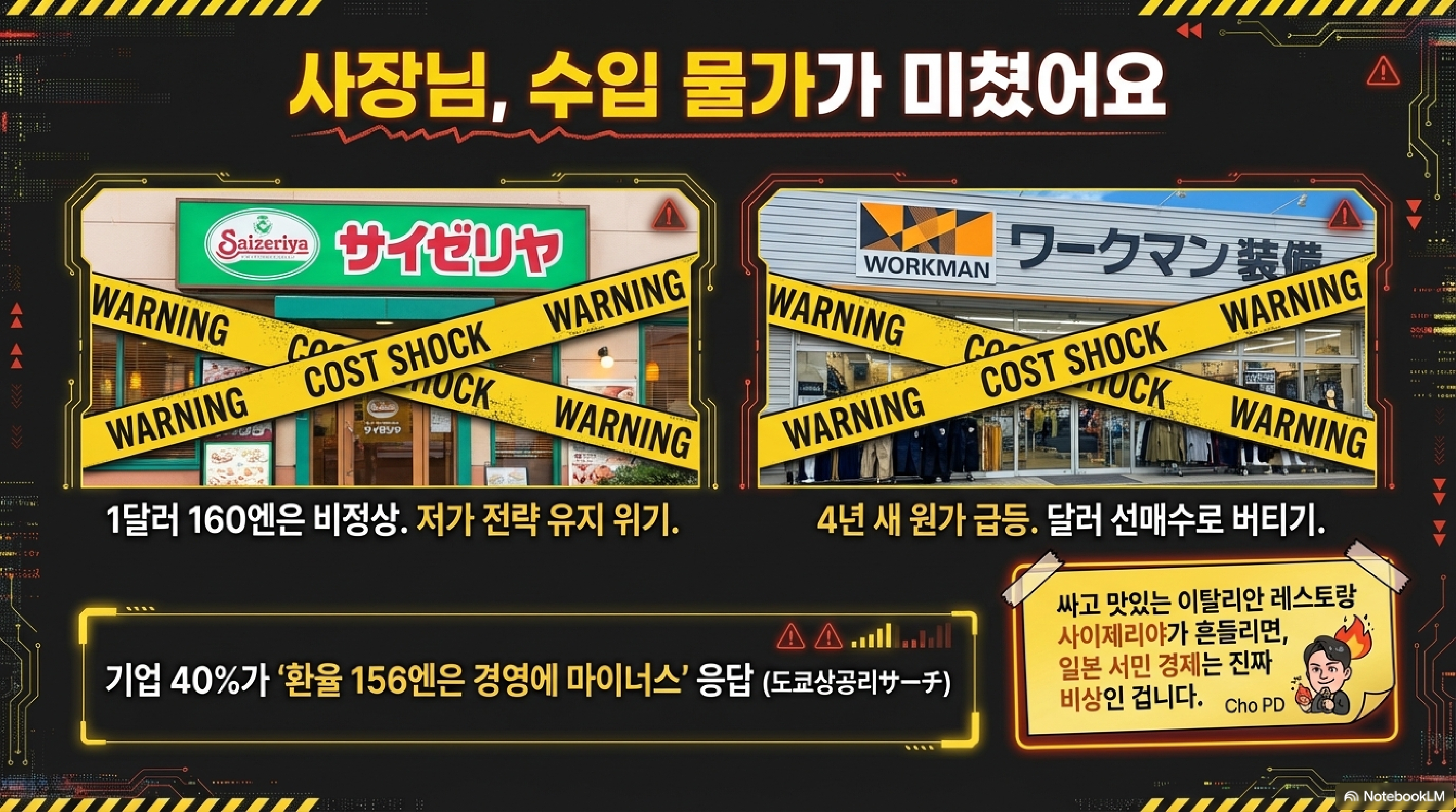 - 수출 잔치와 서민의 눈물: 엔저 덕분에 브리지스톤이나 도요타 같은 수출 기업들은 사상 최대 실적을 내며 잔치를 벌입니다. 하지만 사이제리야 같은 서민 식당 사장님은 "1달러에 160엔은 이상하다"며 탄식합니다. 중소기업 10곳 중 4곳이 "엔저 때문에 망하게 생겼다"고 아우성치는 전형적인 'K자형 양극화'입니다.