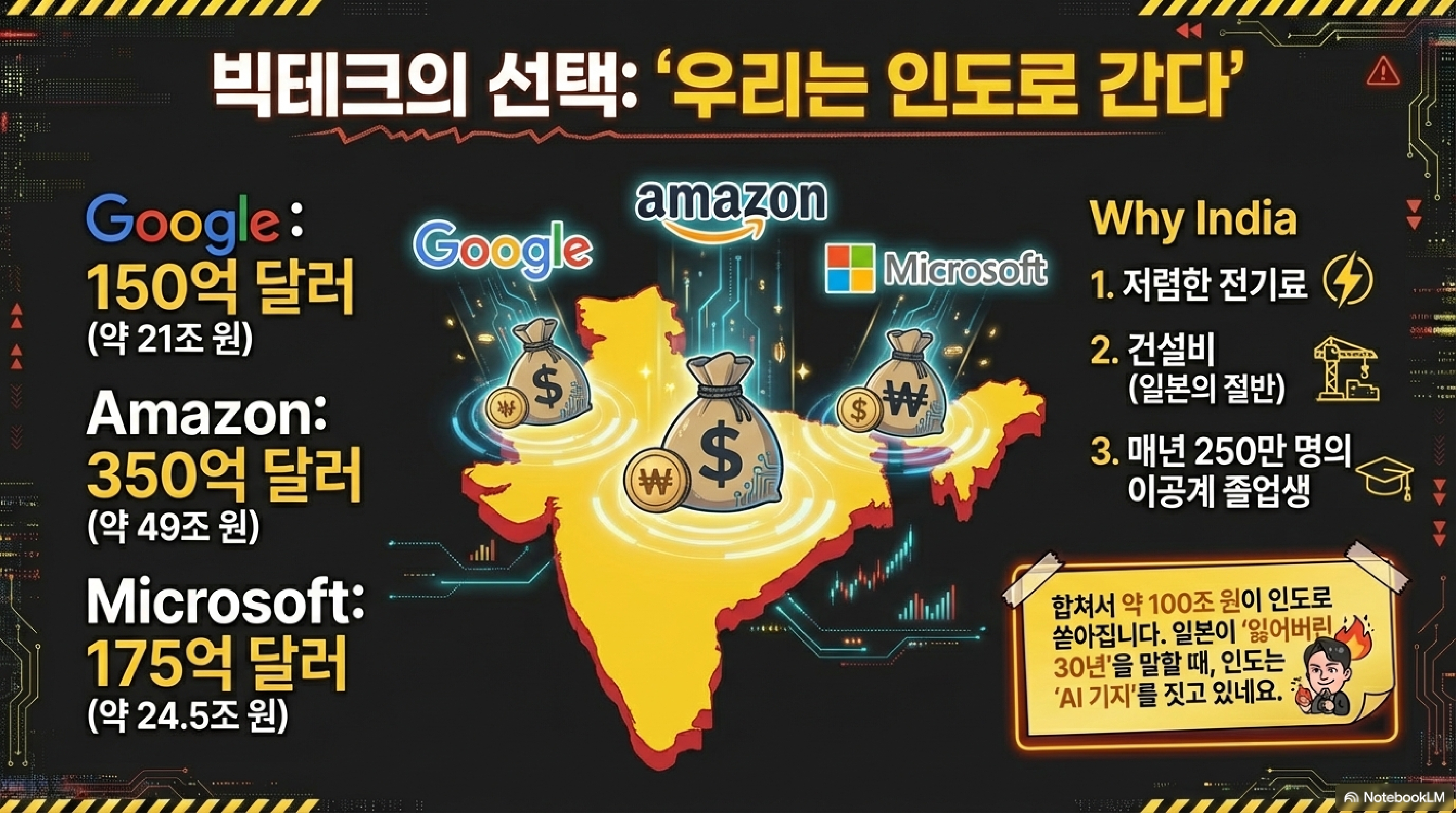 일본이 안에서 엔저와 임금 문제로 씨름하는 동안, 밖에서는 인도가 일본의 'AI 데이터센터' 자리까지 넘보고 있습니다. '주요 외신들' 보도에 따르면 구글과 아마존이 인도에 무려 10조 엔(약 93조 원)을 쏟아붓고 있습니다.