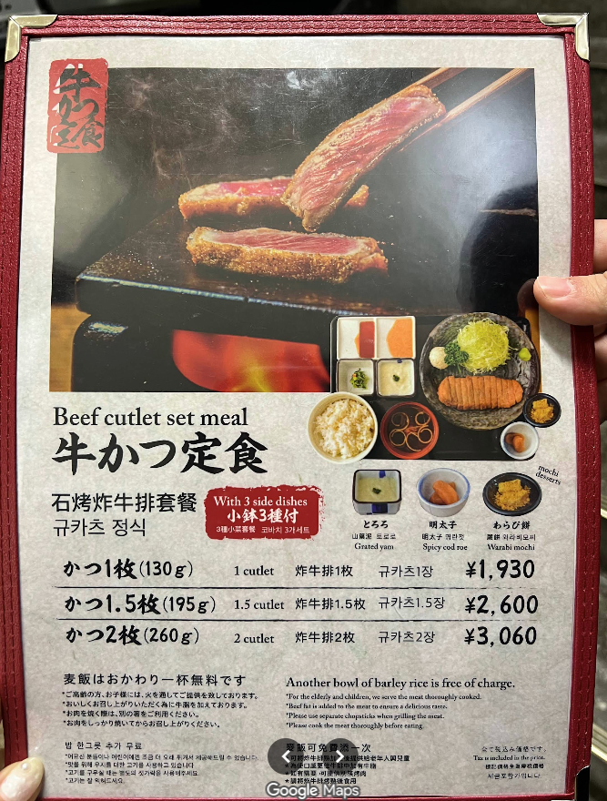 - 주문 팁: 한국어 메뉴판이 있어 주문이 편하고, 성인 기준 기본 1장(130g)은 다소 부족할 수 있으니 1.5장(195g) 세트로 주문하는 것을 추천합니다.