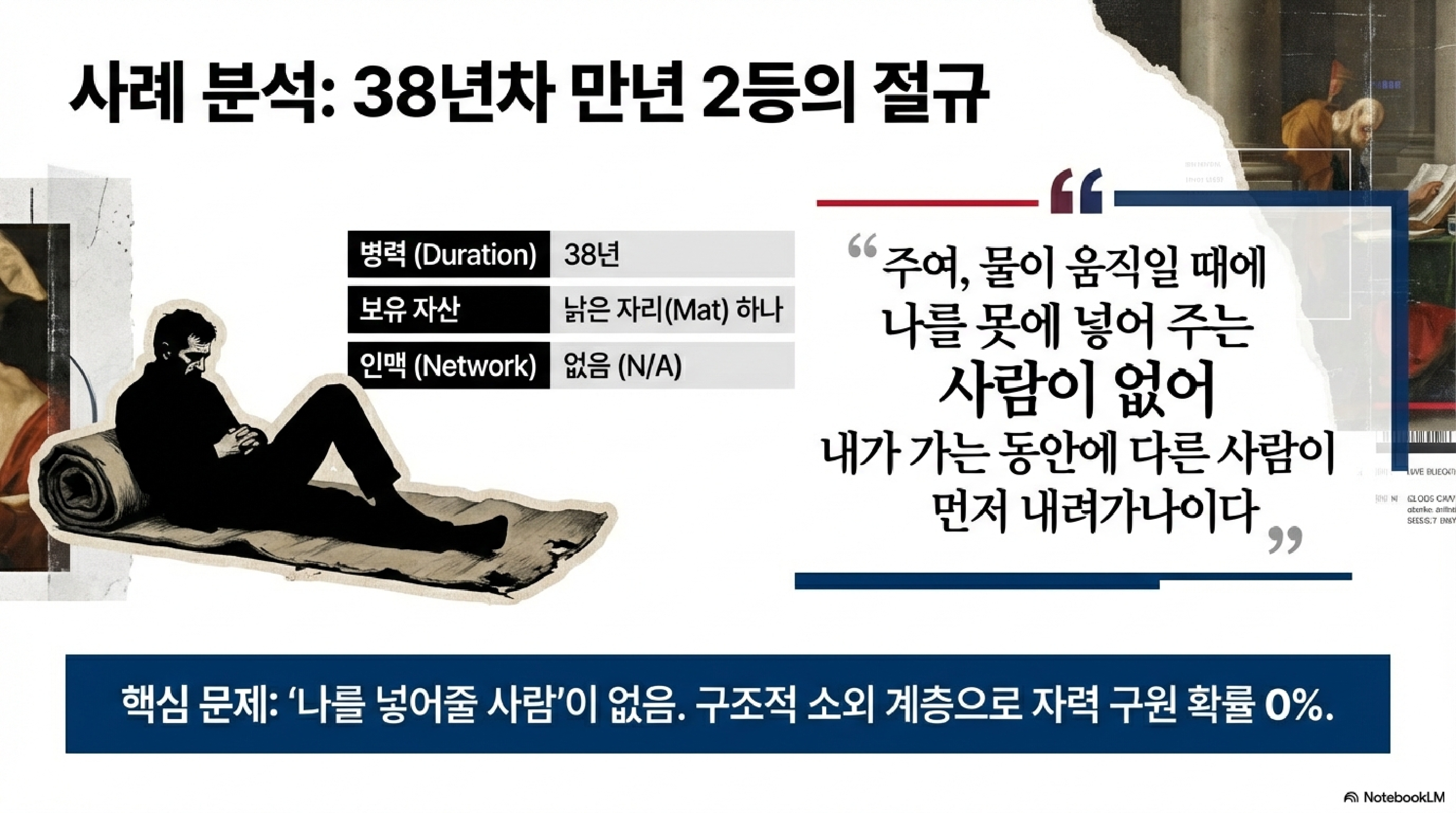 이 질문을 들은 환자의 반응이 흥미롭습니다. 보통은 네!라고 소리쳐야 정상인데, 이분은 바로 남 탓부터 시전합니다. 주님, 물이 움직일 때 나를 넣어줄 사람이 없습니다. 내가 가는 동안에 남들이 먼저 들어갑니다. 슈카월드 식으로 분석하자면, 이분은 지금 자신의 에이전시를 환경에 완전히 아웃소싱한 상태입니다. 나를 밀어줄 금수저 인맥이 없다, 시스템이 불공정하다며 구조적 모순만 탓하고 있는 것이죠. 38년 동안 기회를 놓친 이유를 본인의 실행력이 아닌 타인의 부재에서 찾는, 전형적인 패배주의적 데이터 해석입니다.