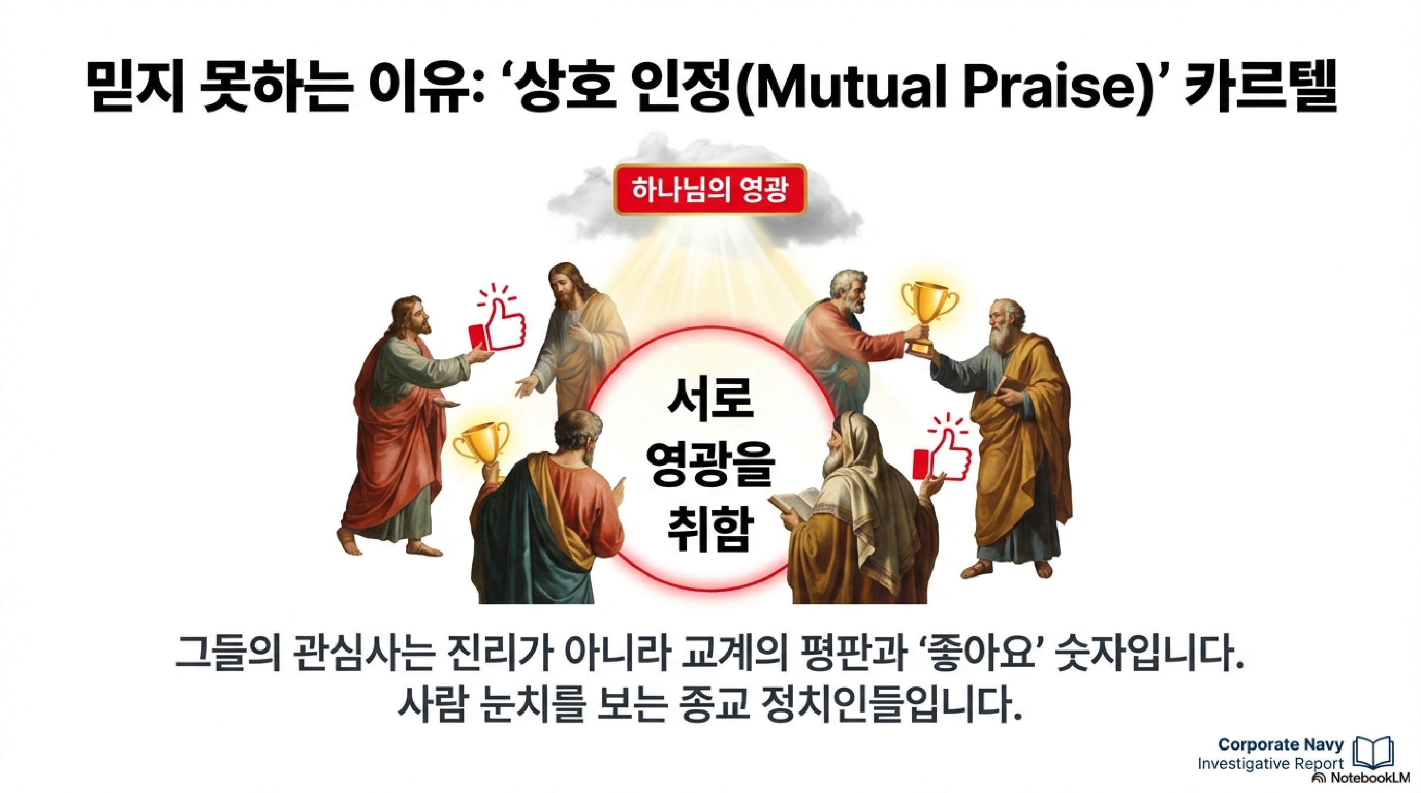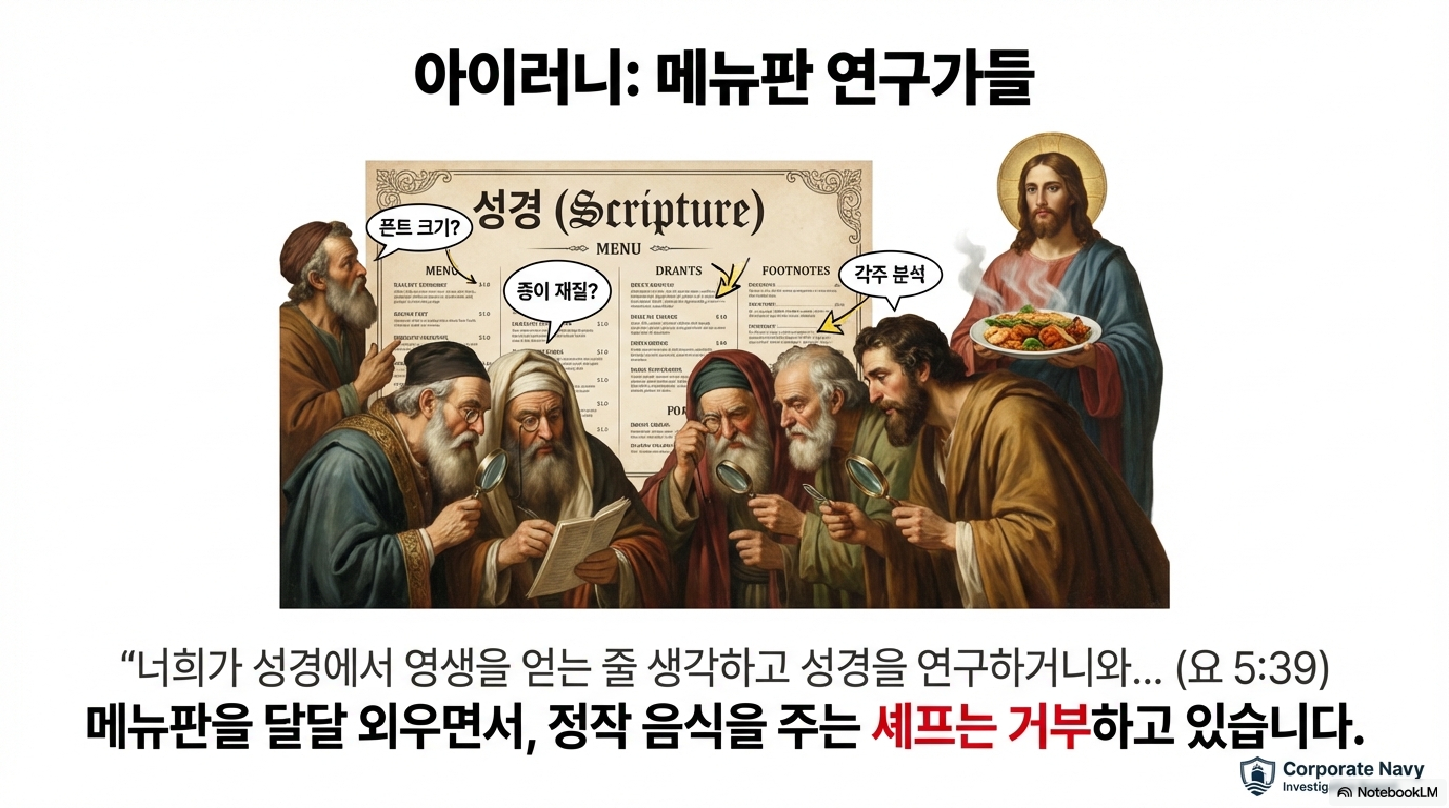첫째는 세례 요한의 증언, 둘째는 현재 예수가 행하고 있는 기적과 사역들, 셋째는 하나님 아버지의 직접적인 증언, 그리고 마지막으로 성경과 모세의 기록입니다. 여기서 예수는 유대인들의 뼈를 때리는 인사이트를 던집니다. 시청자들께서도 아시다시피 유대인들은 성경을 달달 외우는 전문가들입니다. 그런데 정작 성경의 주인공인 예수는 알아보지 못합니다. 이건 맛집 블로그 리뷰는 수만 건을 분석하면서 정작 그 식당에는 한 번도 안 가는 사람, 혹은 기계 매뉴얼은 완벽하게 암기했는데 전원 버튼이 어디 있는지 모르는 기술자와 같습니다. 텍스트 데이터에만 매몰되어 실제 실행 데이터인 생명을 거부하는 아이러니를 날카롭게 꼬집은 것입니다.