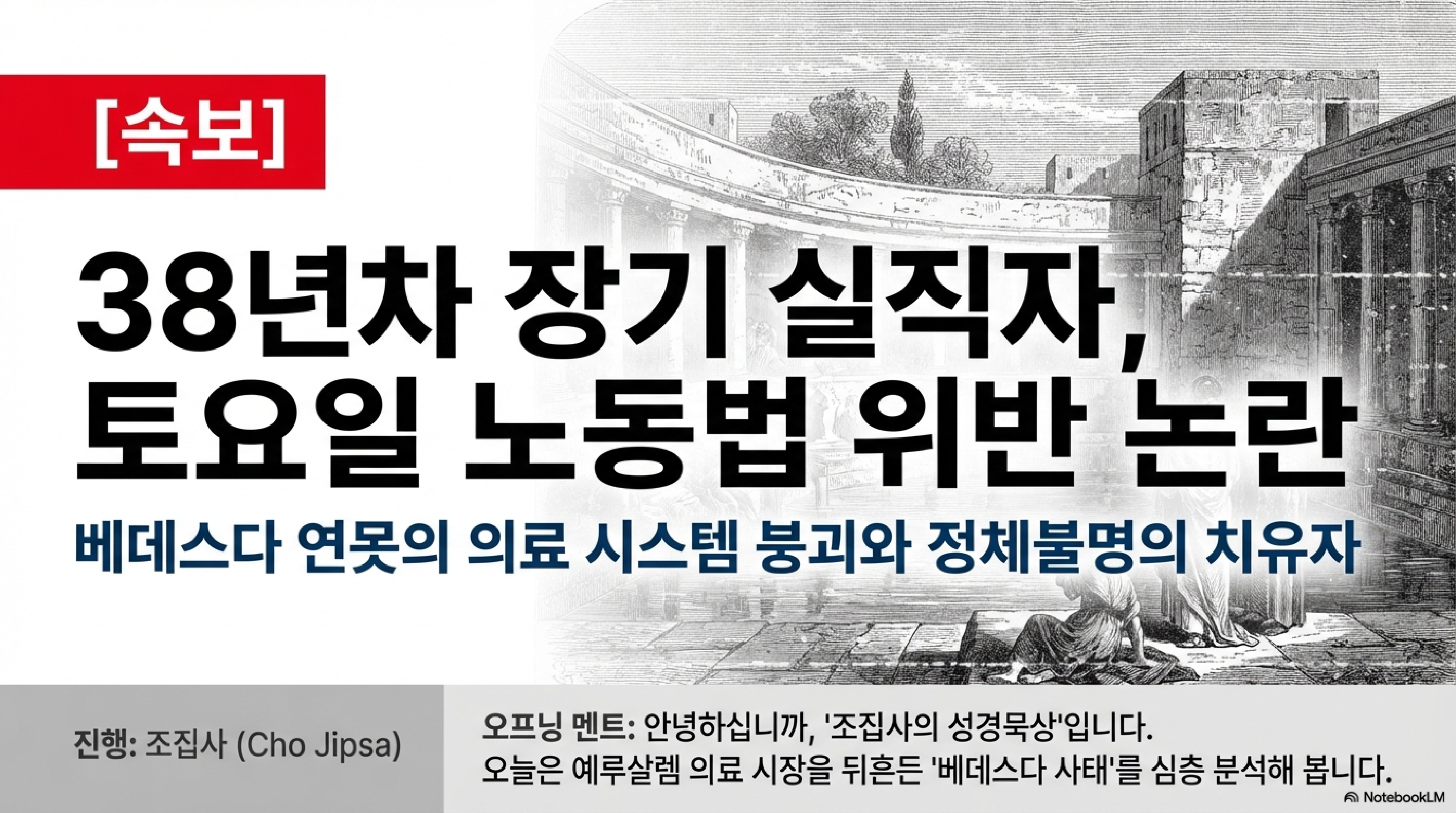 오늘 우리가 살펴볼 데이터는 요한복음 5장입니다. 무대는 예루살렘 양의 문 곁에 위치한 베드자다, 즉 베데스다라는 못입니다. 자, 시청자들께서 이 광경을 머릿속에 그려보시죠. 다섯 개의 주랑 아래 수많은 환자가 바글바글합니다. 왜냐? 가끔 천사가 내려와서 물을 휘저을 때 가장 먼저 다이빙하는 딱 한 명만 병이 낫는다는 정보가 돌았기 때문입니다. 이게 뭡니까? 전형적인 정보의 비대칭성과 극심한 시장 실패의 현장입니다. 은혜의 집이라는 이름이 무색하게, 사실상 로또 명당이나 한정판 오픈런보다 더 잔혹한 선착순 서바이벌 게임이 벌어지고 있었던 것이죠.