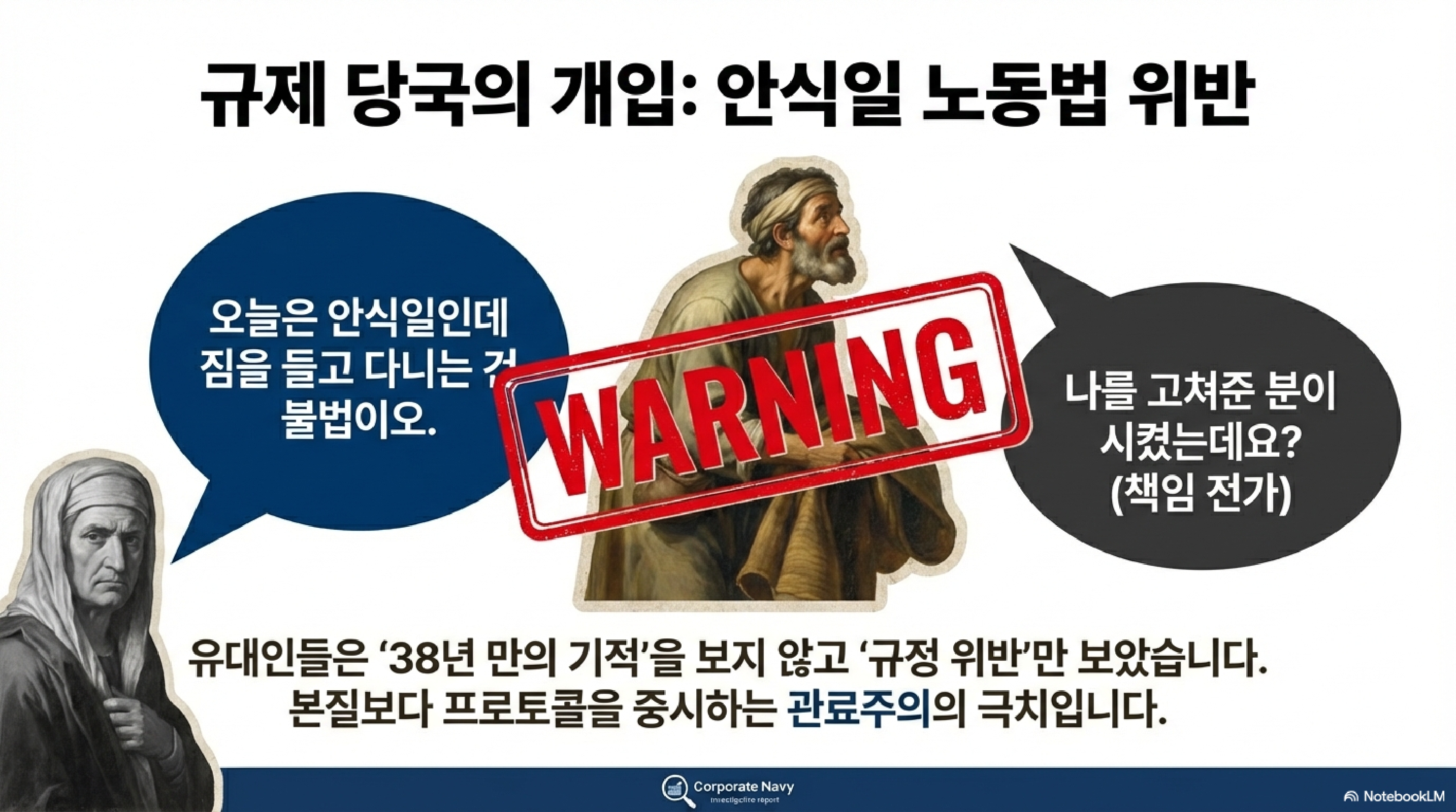 그런데 이 대박 사건을 보고 뒷목을 잡는 사람들이 나타납니다. 바로 당시의 규정 지상주의자들인 유대인들입니다. 38년 된 환자가 일어난 기적에는 관심이 없습니다. 오로지 오늘은 안식일인데 왜 짐을 들고 가냐며 규정 위반을 따집니다. 이건 마치 심정지로 쓰러진 사람을 심폐소생술로 살려놨더니, 살려준 사람한테 당신 의료 면허증 최신화했어? 왜 지정 구역 밖에서 시술해서 바닥 더럽혀?라고 민원을 넣는 악성 민원인의 태도와 같습니다.