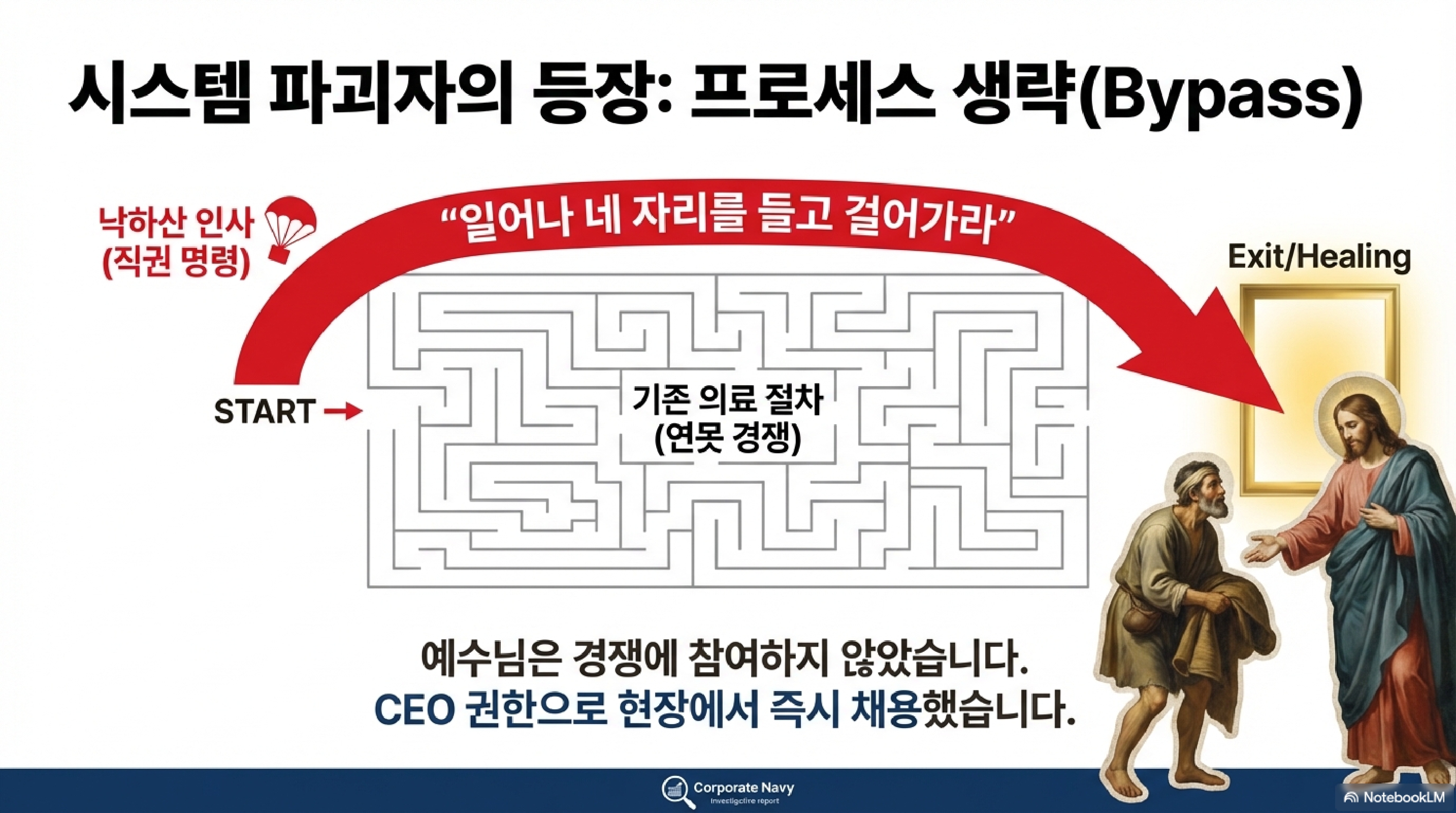 하지만 예수는 이 지루한 하소연을 들어주며 토론하지 않습니다. 그냥 네 자리를 들고 걸어가라는 말씀 한마디로 상황을 종료시킵니다. 1등만 낫는다는 베드자다의 비효율적인 룰을 무시하고, 말씀이라는 치트키를 써서 시스템 자체를 셧다운시켜 버린 것입니다. 복잡한 절차나 인맥 없이 본질적인 해결책을 제시한 일종의 시장 파괴적 혁신이라고 볼 수 있습니다.