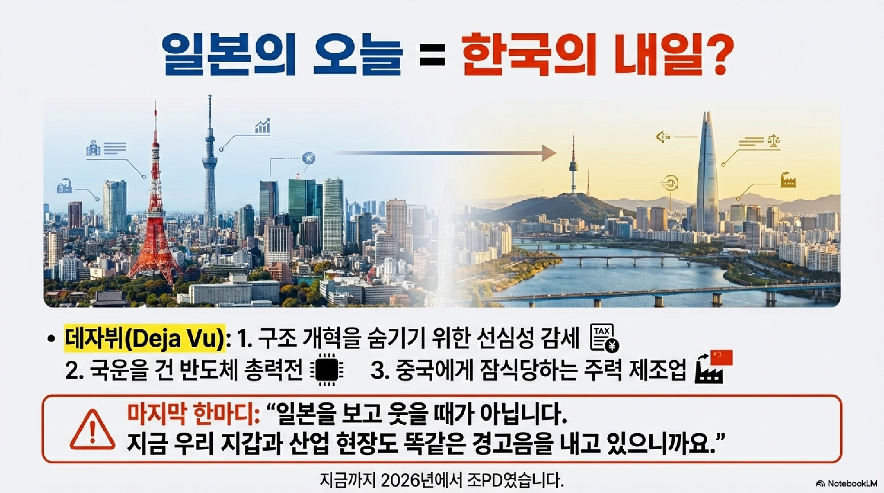 시청자들께서도 보시다시피 일본의 변화는 강 건너 불구경이 아닙니다. 일본이 겪는 저출산, 부동산 거품, 조세 불평등의 막다른 골목은 우리가 걸어가고 있는 길과 소름 돋게 닮아 있습니다. 열도에 부는 독한 바람을 보며 우리가 챙겨야 할 것은 무엇인지, 일본의 실패와 도전을 우리의 백신으로 삼아야 할 때입니다.