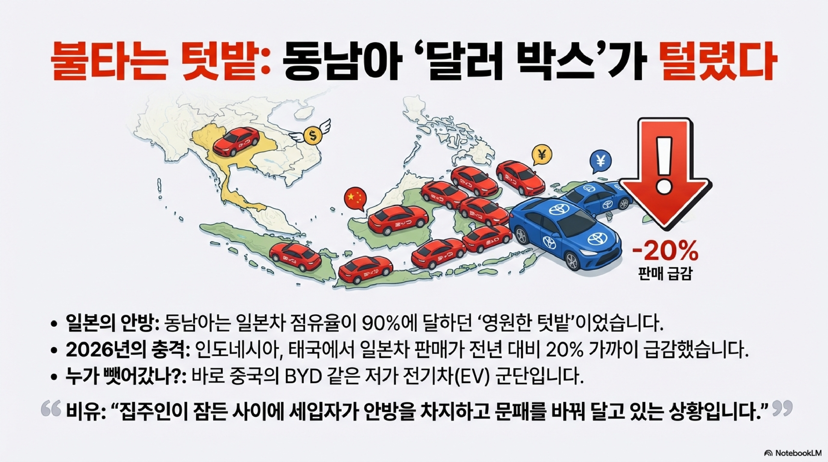반면, 자동차 쪽은 초비상입니다. 일본차의 앞마당이었던 동남아에서 중국 전기차(EV)가 깽판을 치고 있습니다. 태국에서 일본차 점유율이 9%나 급락했고, 인도네시아에서는 BYD가 약 180만 엔, 우리 돈 약 1,600만 원대의 저가 EV 'ATTO1'을 앞세워 도요타의 턱밑까지 쫓아왔습니다. 도요타가 '하이브리드(HV) 멀티 패스웨이'로 버티며 체력 싸움을 걸고 있지만, 닛산과 혼다는 이미 생산 능력을 줄이며 후퇴 중입니다. 이건 우리 현대·기아차에겐 천재일우의 기회인 동시에, 중국발 저가 EV 쓰나미에 함께 쓸려나갈 수 있다는 경고등입니다.