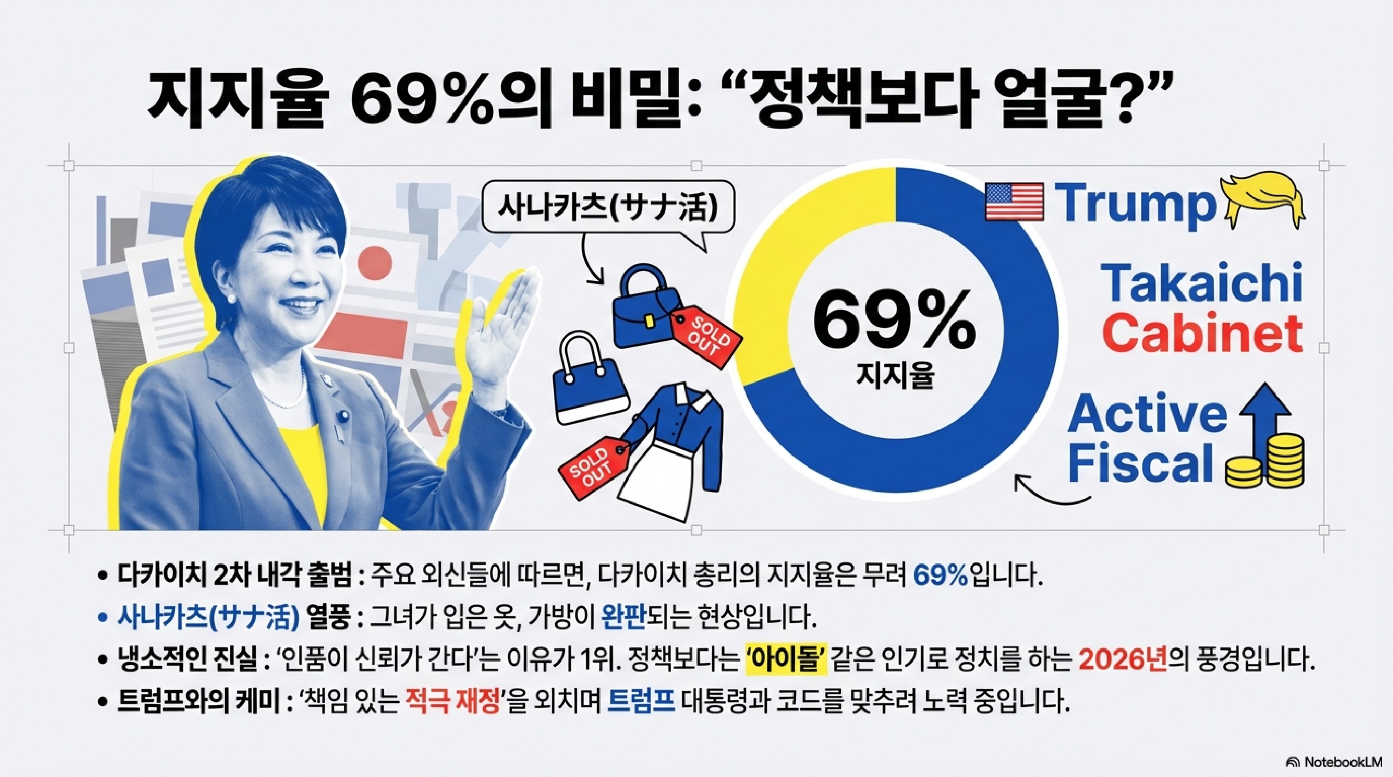 다카이치 사나에 총리의 시정방침 연설안을 뜯어보면 아주 발칙한 단어가 나옵니다. 바로 '예산의 다년도화'입니다. 매년 찔끔찔끔 예산 짜다가 보정예산으로 땜질하던 그 구태의연한 짓을 이제 안 하겠다는 겁니다. "우리가 수년 동안 이만큼 돈을 부을 거니까 기업들 너희는 쫄지 말고 투자해"라는 신호를 주는 거죠. 덕분에 내각 지지율은 무려 69%를 찍었습니다. 총리가 든 가방이나 액세서리를 따라 사는 '사나활(사나에 활동)' 열풍까지 불고 있는데, 시니컬하게 보면 정책의 알맹이보다 '정치인의 팬덤'이 경제 심리를 지배하는 묘한 상황입니다.