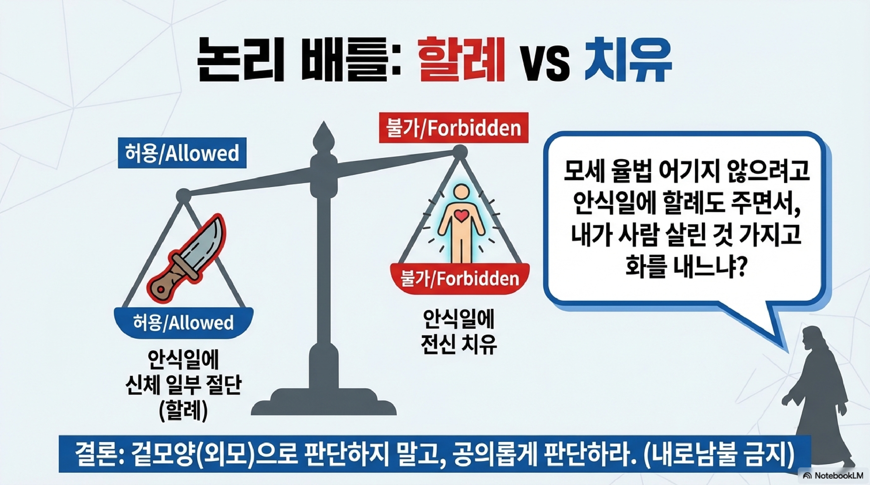 예수님의 논리는 명쾌합니다. "너희는 안식일에 할례는 왜 하냐? 율법 전통 지키겠다고 안식일에 신체 일부를 자르는 '특례 조항'은 인정하면서, 내가 사람 몸 전체를 건강하게 복구한 건 왜 불법이라고 난리냐?" 이것이 바로 리걸리즘 1.0에 갇힌 꼰대들을 향한 에센셜 저스티스 2.0의 일침입니다. 겉모양과 스펙이라는 필터로 본질을 가리지 말고 공정하게 심판하라는 이 팩트폭격은 오늘날 외모지상주의와 학벌 카스트에 찌든 우리 사회에도 유효한 사이다입니다.