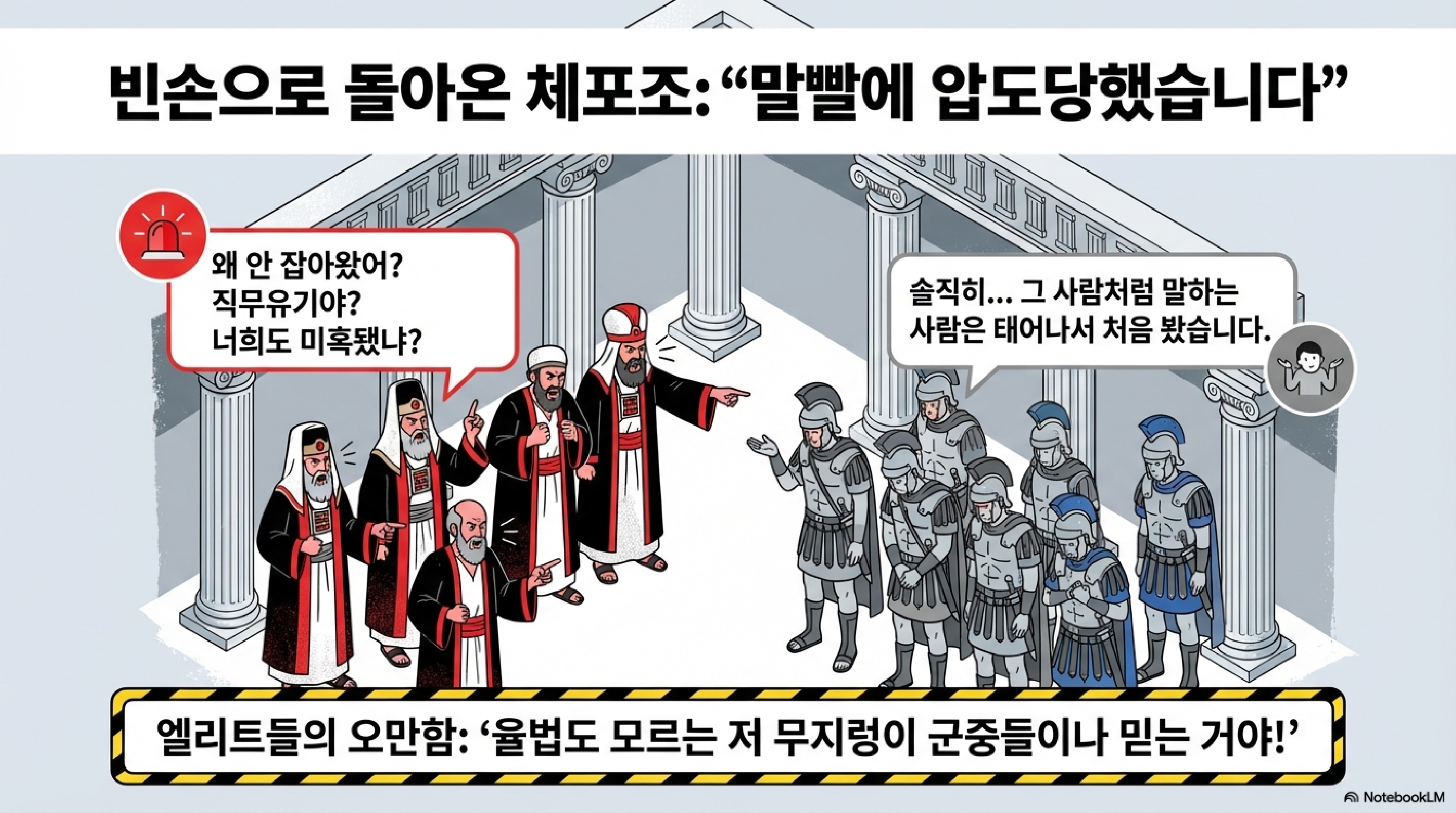 왜냐고요? 기득권 세력인 유대인 지도자들에게 찍히면 커뮤니티에서 '상장 폐지', 즉 출교당할까 봐 무서웠던 거죠. 1세기 예루살렘의 사회 신용 시스템은 현대의 캔슬 컬처보다 더 지독했습니다. 다들 수군거리기만 할 뿐, 진실을 말하면 사회적으로 매장되는 이 공포 정치가 지배하는 축제 현장, 그 한복판에 드디어 주인공이 갑자기 나타나 판을 흔들어버립니다.