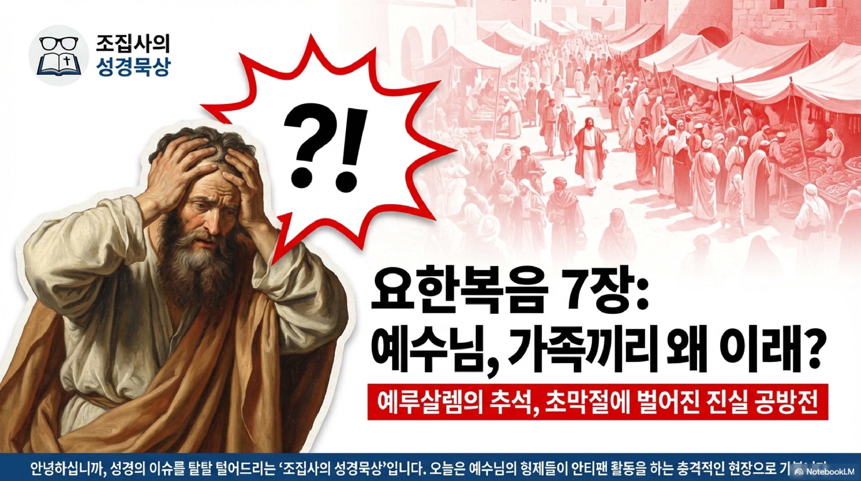 조집사의 성경묵상입니다. 오늘 우리가 다룰 요한복음 7장은 한마디로 화려한 축제의 조명 뒤에서 칼날을 가는 느와르 영화라고 정의할 수 있습니다. 명절의 들뜬 공기와 살벌한 살해 위협이 공존하는 기묘한 현장이죠. 왜 우리가 이 2천 년 전의 눈치 싸움에 주목해야 할까요? 그건 예나 지금이나 대중은 진실보다는 평판에, 본질보다는 스펙에 휘둘리는 주식 종목 토론방 같은 인생을 살고 있기 때문입니다. 시청자들께서도 오늘 말씀을 통해 본인이 과연 정보의 비대칭성을 극복하고 본질을 보고 있는지, 아니면 그저 세력의 눈치만 보고 있는지 전략적으로 분석해 보시죠. 자, 먼저 가족이라는 이름의 '빌런'들이 벌이는 패밀리 비즈니스의 비극부터 시작합니다.