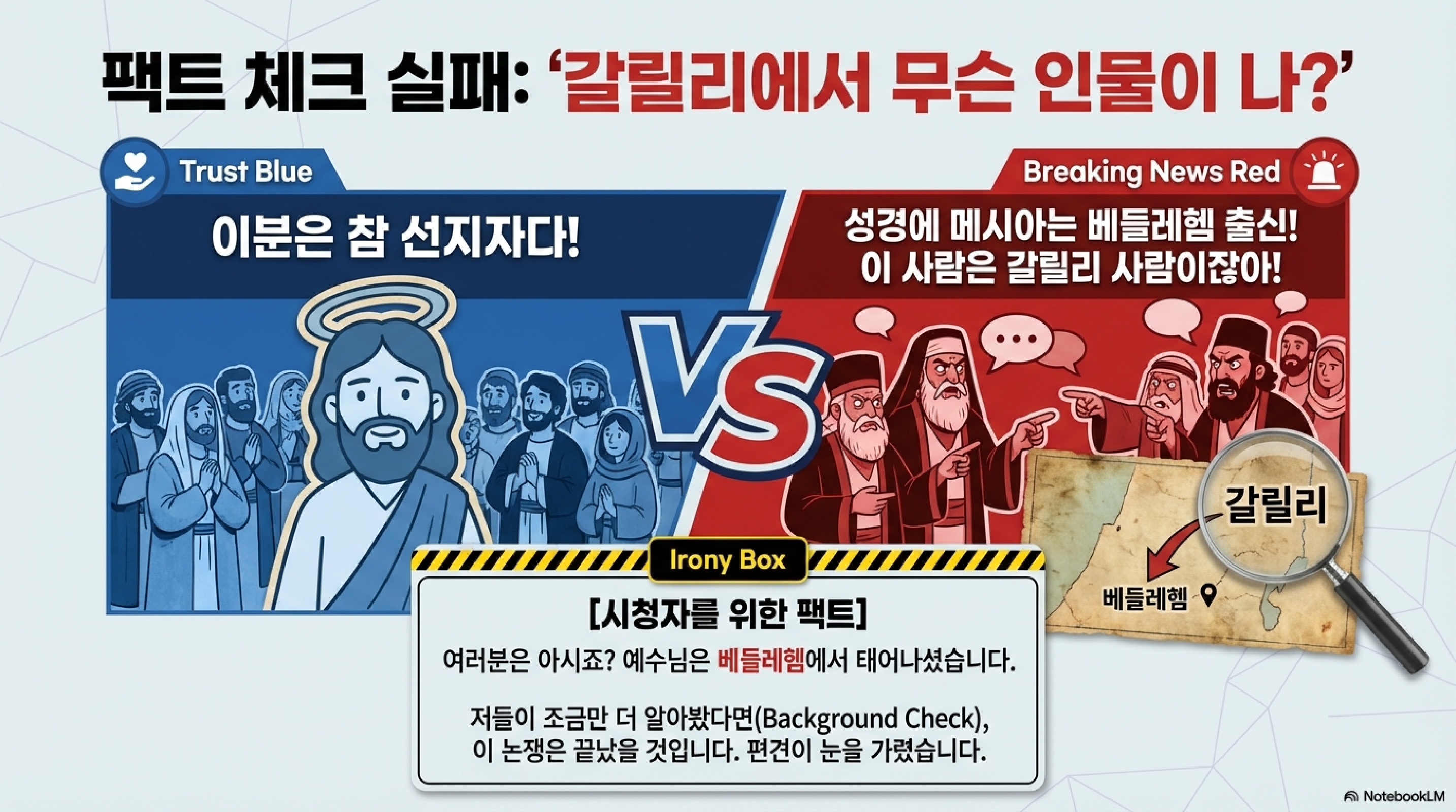논리에서 밀리니 이제는 '출신 성분'을 따지는 확증 편향이 발동합니다. 군중들은 "우리는 이 사람의 출신(갈릴리)을 안다. 진짜 메시아는 어디서 오는지 몰라야 한다"며 자기들만의 메시아 가이드라인을 들이댑니다. 그런데 여기서 엄청난 코미디가 발생합니다. 나중에 그들은 "성경에 메시아는 베들레헴에서 나온다고 했는데 이 사람은 갈릴리 아니냐"며 또 반대하거든요. 정작 예수님이 베들레헴 태생이라는 기초적인 배경 조사, 즉 듀 딜리전스조차 안 해본 채 전문가 행세를 한 겁니다.