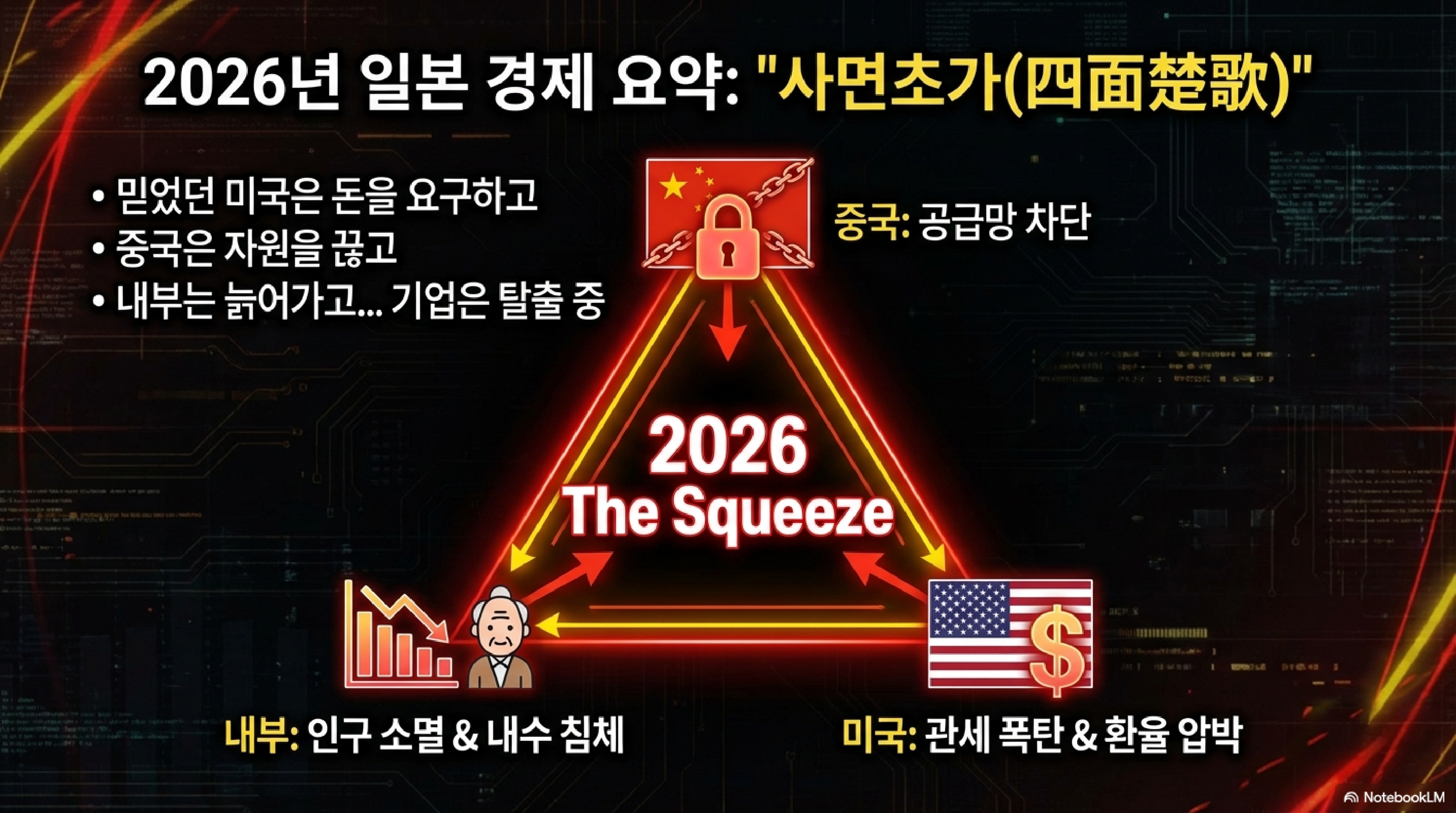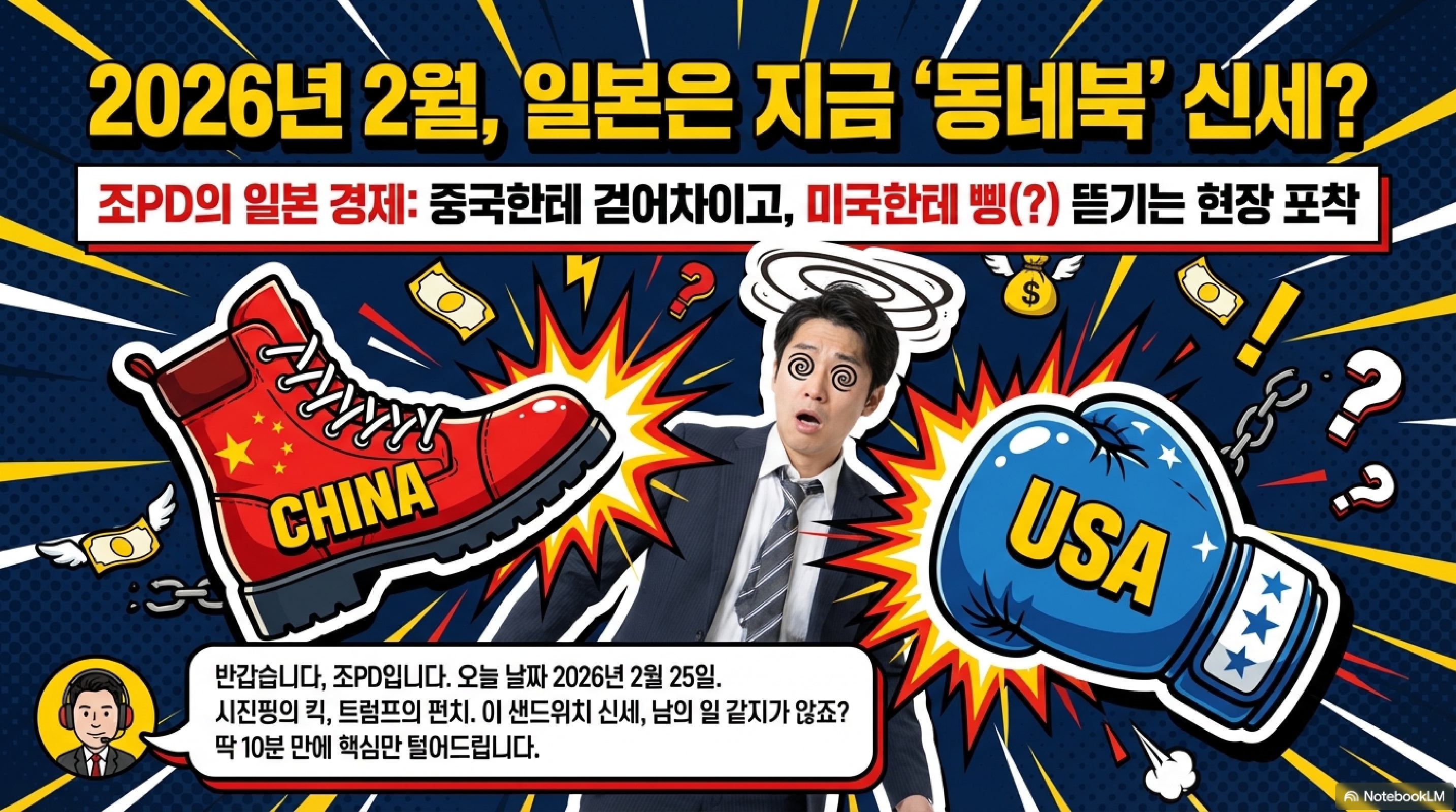 여러분, 지금 일본 경제 상황을 한마디로 정의하면 그야말로 폭풍 전야입니다. 옆집 싸움 구경이 제일 재밌다지만, 지금 일본이 겪고 있는 꼴은 거의 종합 격투기 수준이죠. 밖에서는 중국이 스나이퍼처럼 일본의 급소를 정밀 조준하고 있고, 태평양 건너 우방이라는 미국은 주인 없는 일본 집에 들어와 제멋대로 청소기를 돌리고 나갑니다.