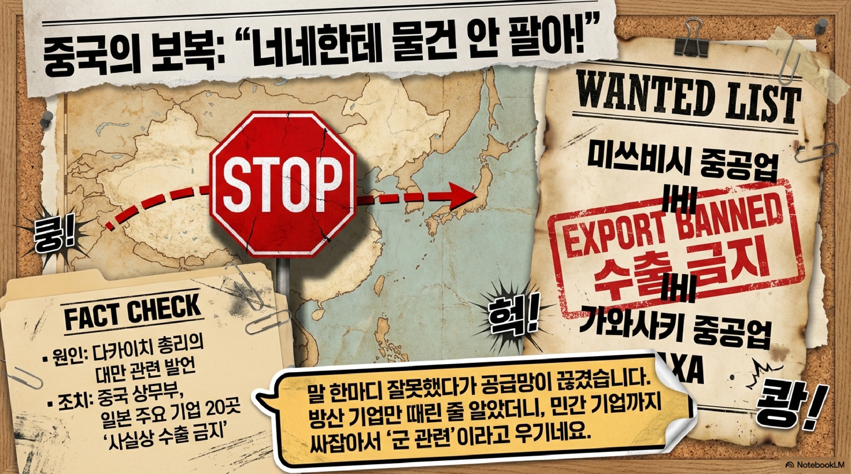 첫 번째로 보실 부분은 중국 상무부가 발표한 아예 숨통을 끊어버리는 금지 리스트입니다. 중국은 미쓰비시 조선, IHI, JAXA(우주항공연구개발기구) 등 20개 기업과 단체를 콕 집어 수출 규제 리스트에 올렸습니다. 이건 단순한 위협이 아닙니다. 우주와 방위 산업의 핵심을 스나이핑한 거죠. 다카이치 사나에 총리가 대만 관련해서 한마디 할 때마다 중국은 "입 조심 안 하면 너희 첨단 산업 엔진을 꺼버리겠다"며 리스트를 업데이트하고 있습니다.