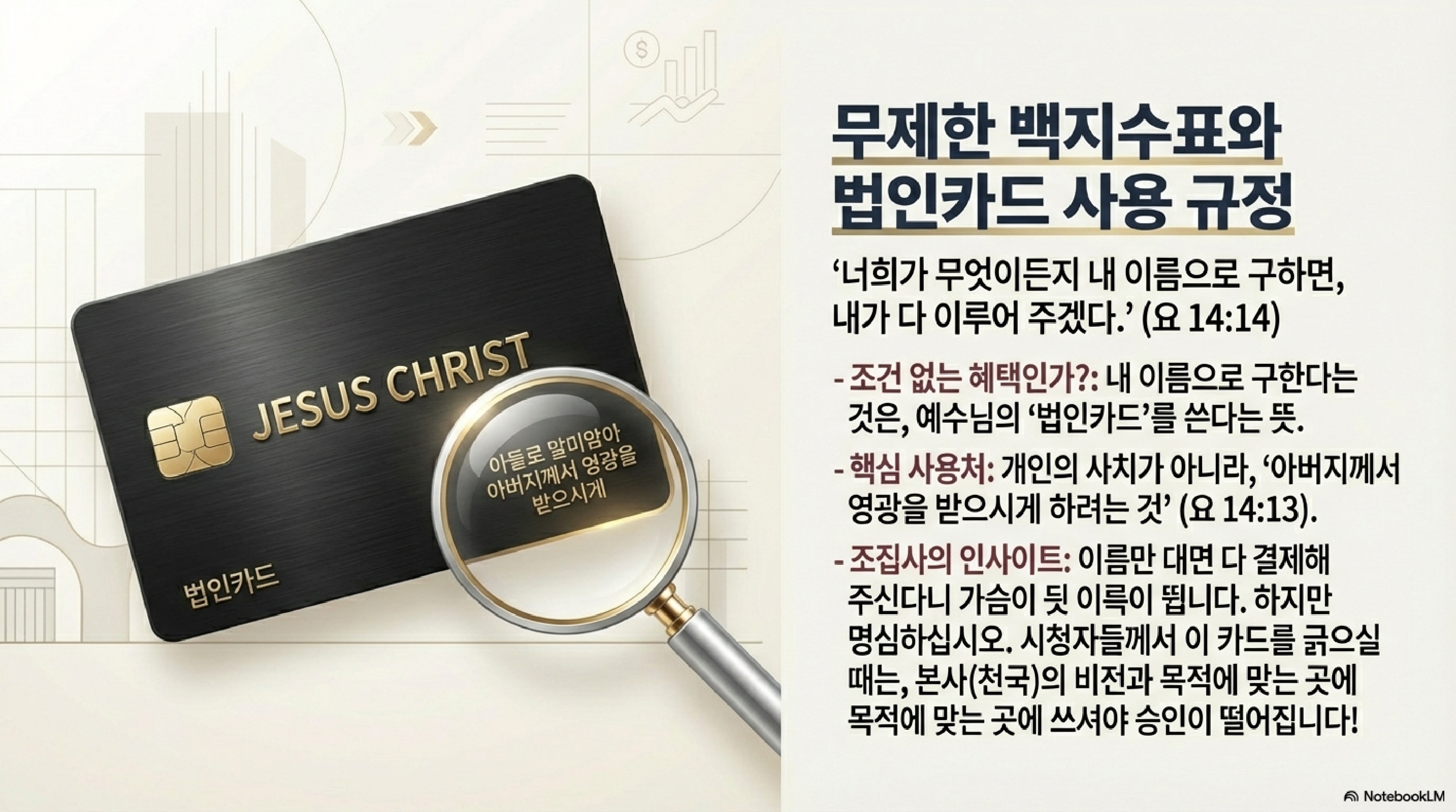 "보혜사"라는 말이 좀 어렵죠? 쉽게 말해 "변호사", "코치", 혹은 "퍼스널 비서"라고 생각하시면 됩니다. 시청자들께서 사회생활 하실 때, 내 편 들어주는 유능한 법무팀과 실수를 커버해 주는 수석 비서가 24시간 붙어 있다고 상상해 보십시오. 업무 효율이 안 오를 수가 없습니다. 심지어 13절과 14절에서는 예수님의 이름으로 구하는 것은 무엇이든 다 이루어 주겠다는 "무제한 리소스 지원"까지 약속하십니다.