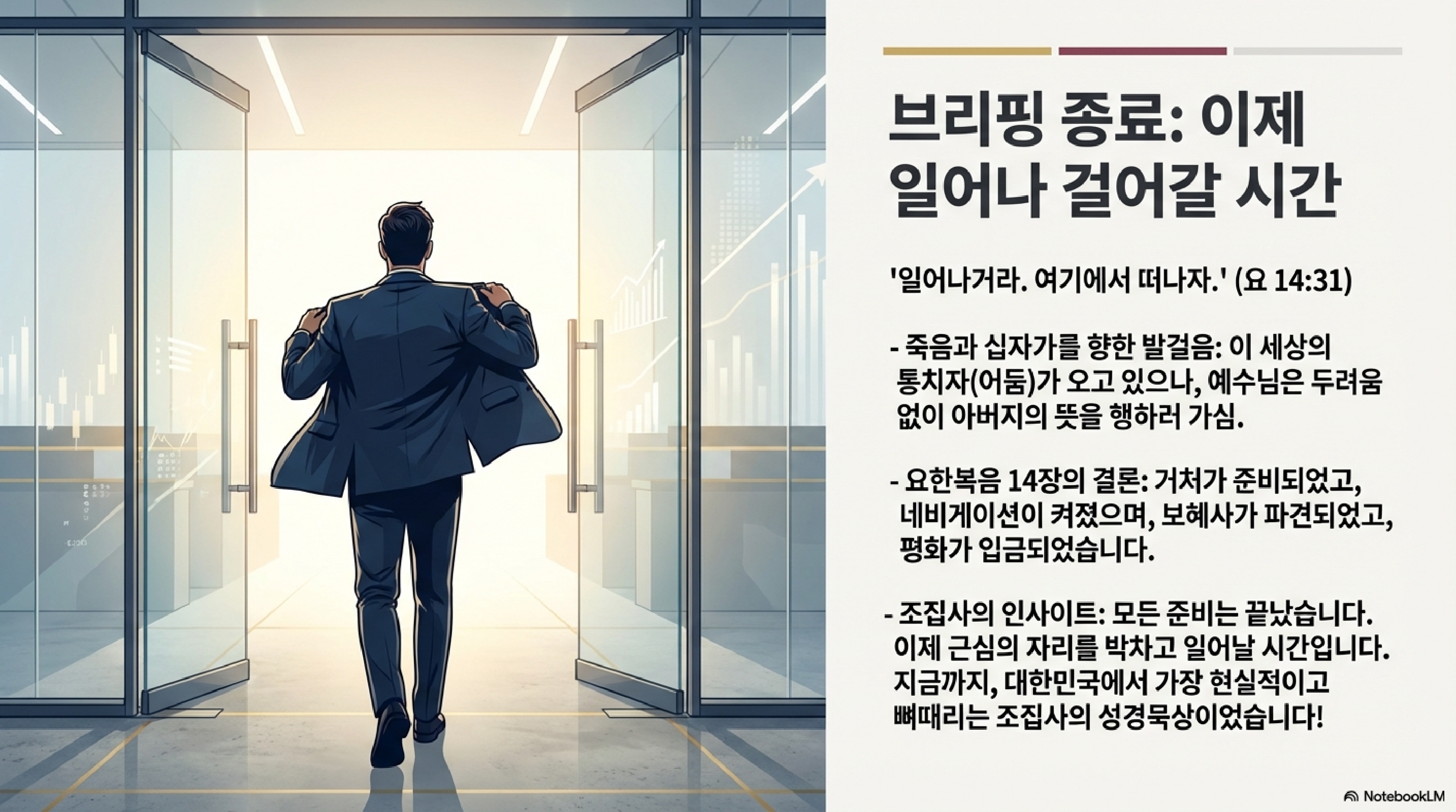 마지막 31절에서 예수님은 "일어나거라. 여기에서 떠나자"고 말씀하십니다. 이게 핵심입니다. 방 안에서 "아, 평안하다" 하고 명상만 하는 게 아니라, 이제 이 든든한 보증과 서포트를 믿고 다시 "현장"으로 나가서 부딪혀 보자는 거죠.