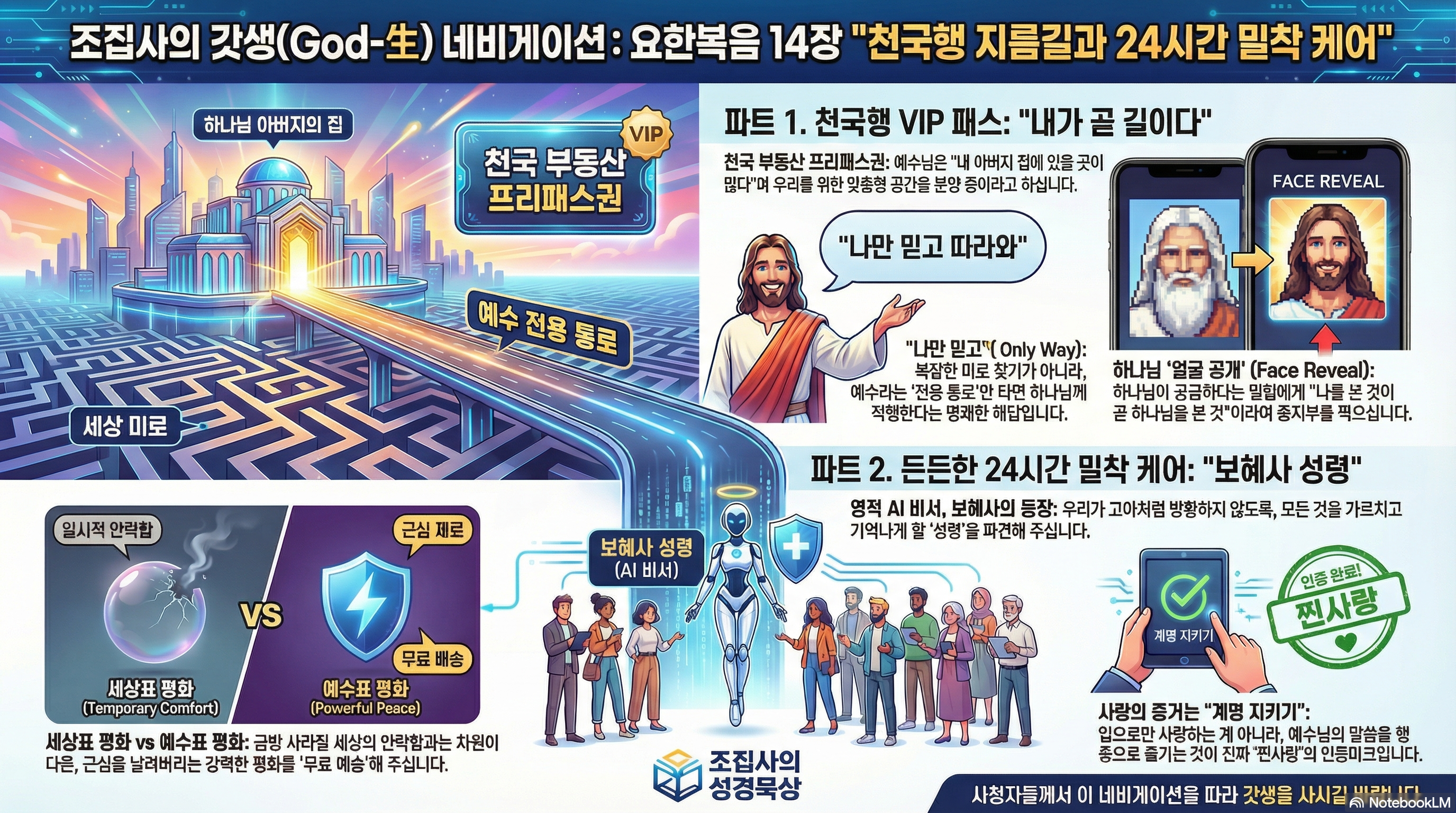 하지만 예수님이 주시는 평안은 "확정 금리형 안전 자산"입니다. 세상의 풍파에 휘둘리지 않는 "심리적 회복 탄력성"을 제공합니다. 하늘나라 부동산(거처)이 확보되어 있고, 성령이라는 특급 비서(보혜사)가 옆에서 가이드해주니, 어떤 위기 앞에서도 멘탈이 흔들리지 않는 겁니다.