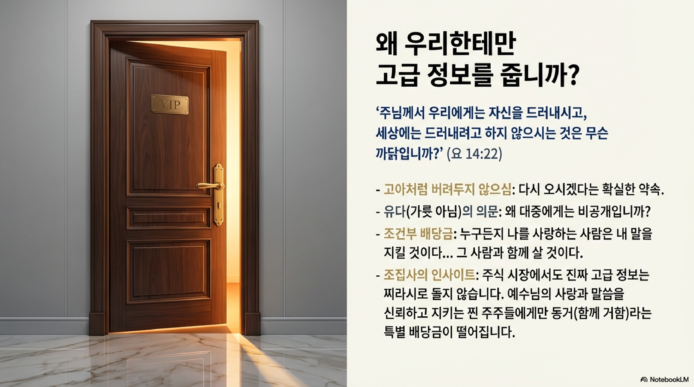 여기서 재미있는 장면이 나옵니다. 22절에 보면 가룟 유다가 아닌 "다른 유다"가 묻습니다. "주님, 왜 우리에게만 자신을 나타내시고 세상에는 안 보여주십니까?" 전형적인 투자자의 질문이죠. "왜 이 좋은 "알파 정보"를 우리 멤버들에게만 공개하느냐"는 겁니다. 예수님은 이것이 철저한 "멤버십 서비스"임을 강조하십니다. 말씀을 지키고 사랑하는 사람들에게만 제공되는 "인사이더 정보"이자 밀착 가이드라는 거죠. 26절 말씀처럼 성령은 실시간으로 예수님의 말씀을 생각나게 하는 "시험 전 요약 노트" 역할을 하며 제자들의 퍼포먼스를 극대화해 주십니다.