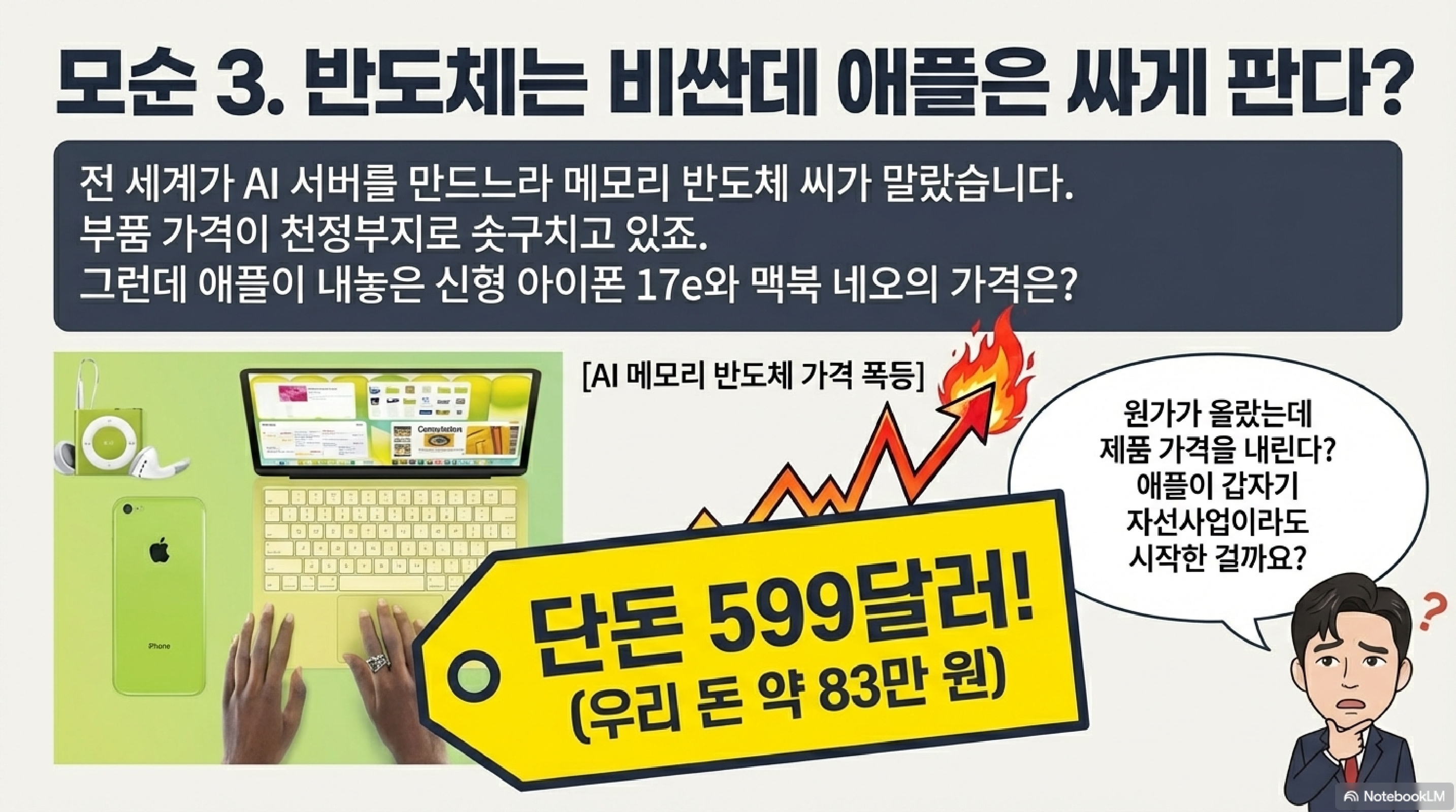 반도체 칩 가격이 AI 서버 수요 때문에 미친 듯이 오르는 와중에 애플이 아주 영악한 카드를 꺼냈습니다. 신형 아이폰 17e의 가격을 599달러로 동결했습니다. 최신 환율인 1달러 당 1,350원에서 1,400원을 적용하면 우리 돈으로 약 81만 원에서 84만 원 수준입니다. 여기에 신형 맥북 네오 역시 599달러라는 파격적인 가격표를 붙였습니다. 얼핏 보면 소비자에게 선물을 주는 것 같지만, 사실 이건 경쟁사들을 말려 죽이려는 독사과 작전입니다.