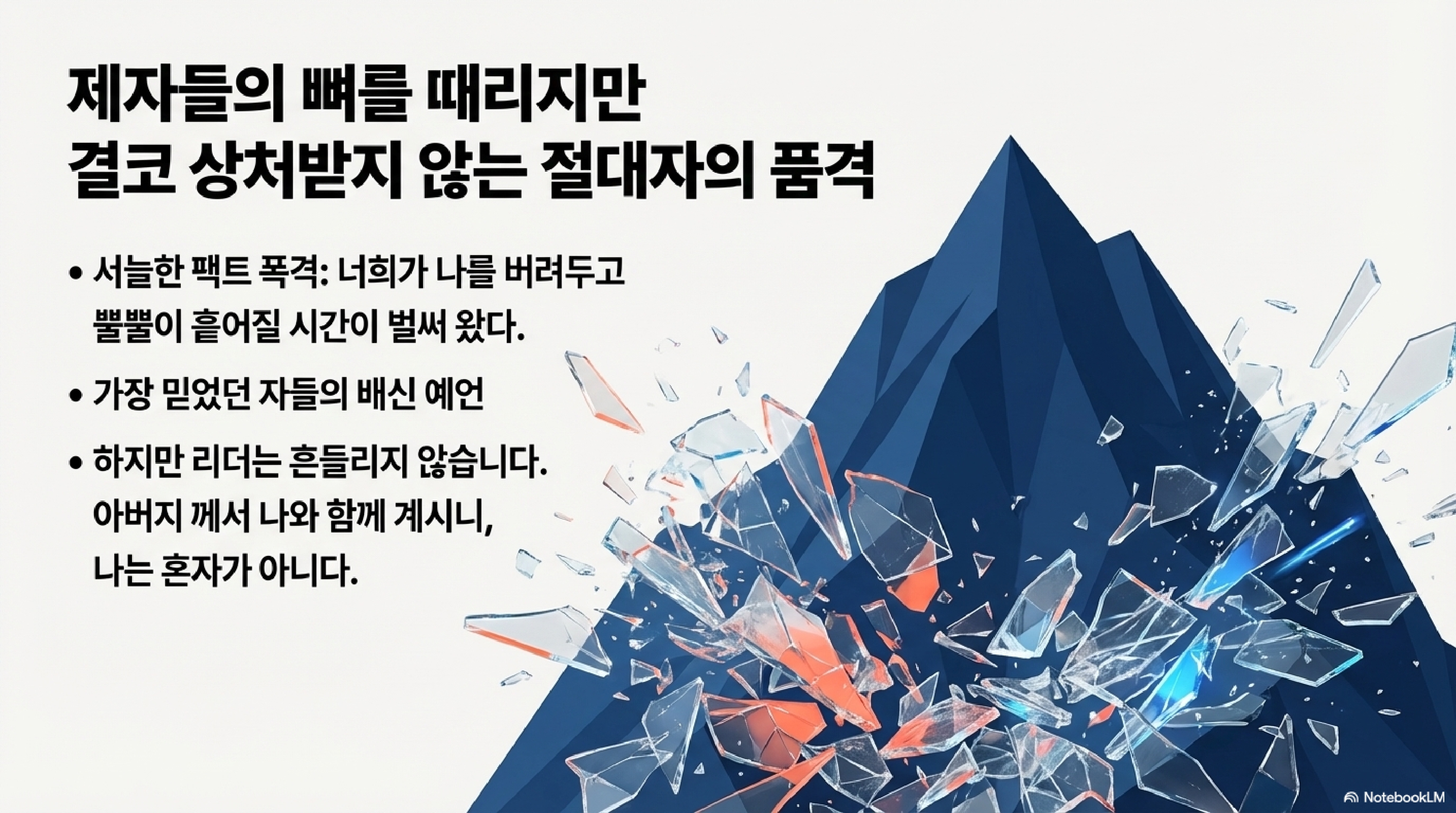 여기서 우리가 주목해야 할 포인트는 이겁니다. 왜 굳이 이 타이밍에 이런 '불편한 진실'을 공개하느냐? 그건 바로 리스크 관리 때문입니다. 나중에 진짜 환난이 닥쳤을 때 "아니, 예수님이 이런 말씀 안 하셨잖아!" 하고 멘붕 와서 손절(배교)하지 않도록, 미리 '예방 주사'를 놔주시는 전략적 선택인 거죠(v.1, v.4). 자, 제자들의 멘탈이 바스라지고 있는 이때, 예수님이 아주 파격적인 '반등 카드'를 제시하십니다. 바로 성령이라는 역대급 카드를 말이죠.