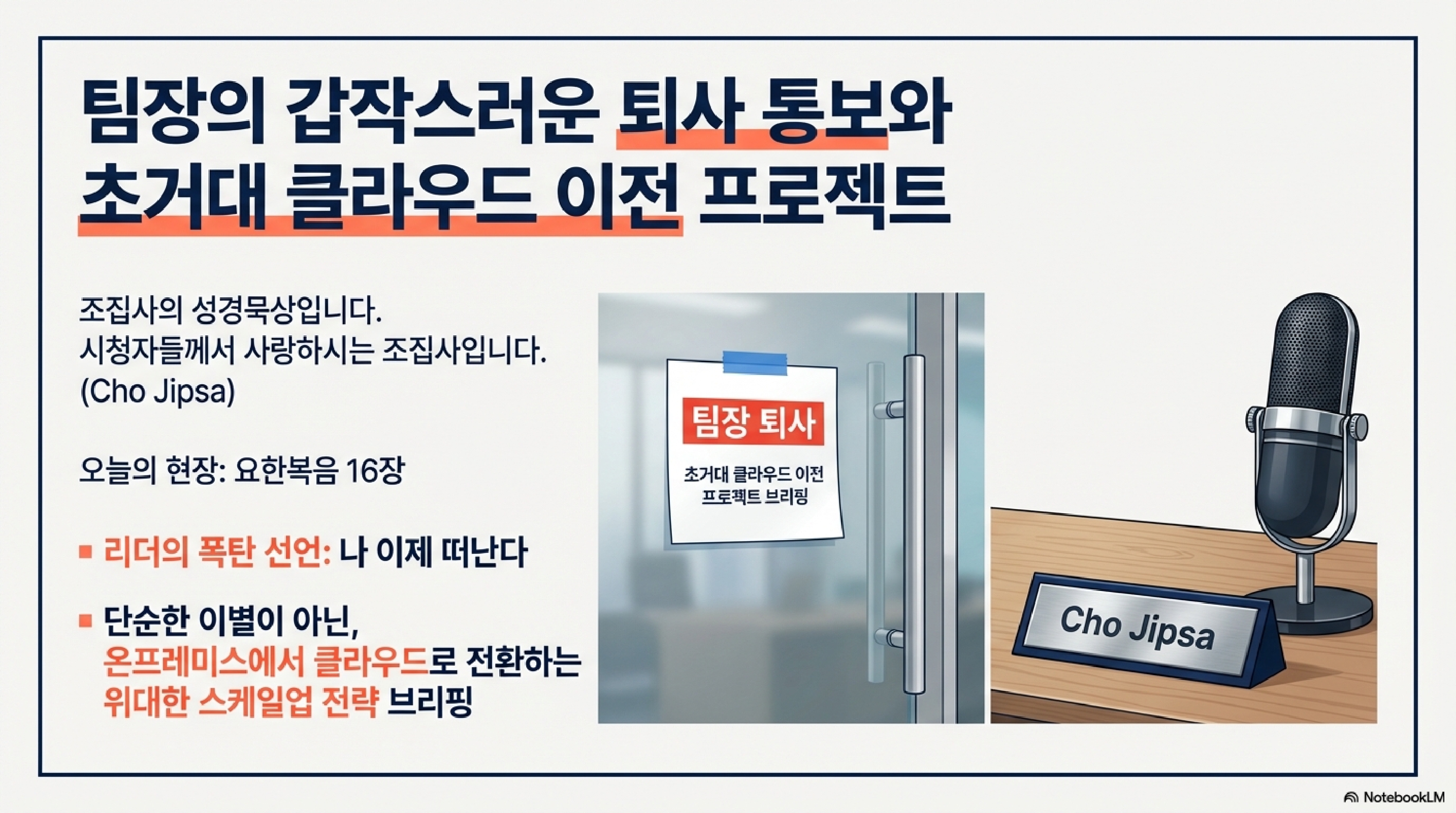'조집사의 성경묵상'입니다. 자, 시청자 여러분, 오늘은 요한복음 16장입니다. 상황이 아주 골 때립니다. 아니, 상식적으로 생각을 해보세요. 지금 예수님이 십자가 지시기 직전, 그러니까 제자들하고 마지막 작별 인사를 하는 '고별 설교'의 정점이거든요? 그럼 보통 "수고했다", "사랑한다" 이런 훈훈한 덕담이 나와야 하잖아요. 그런데 여기서 예수님은 갑자기 _폭탄 발언_을 던지십니다.