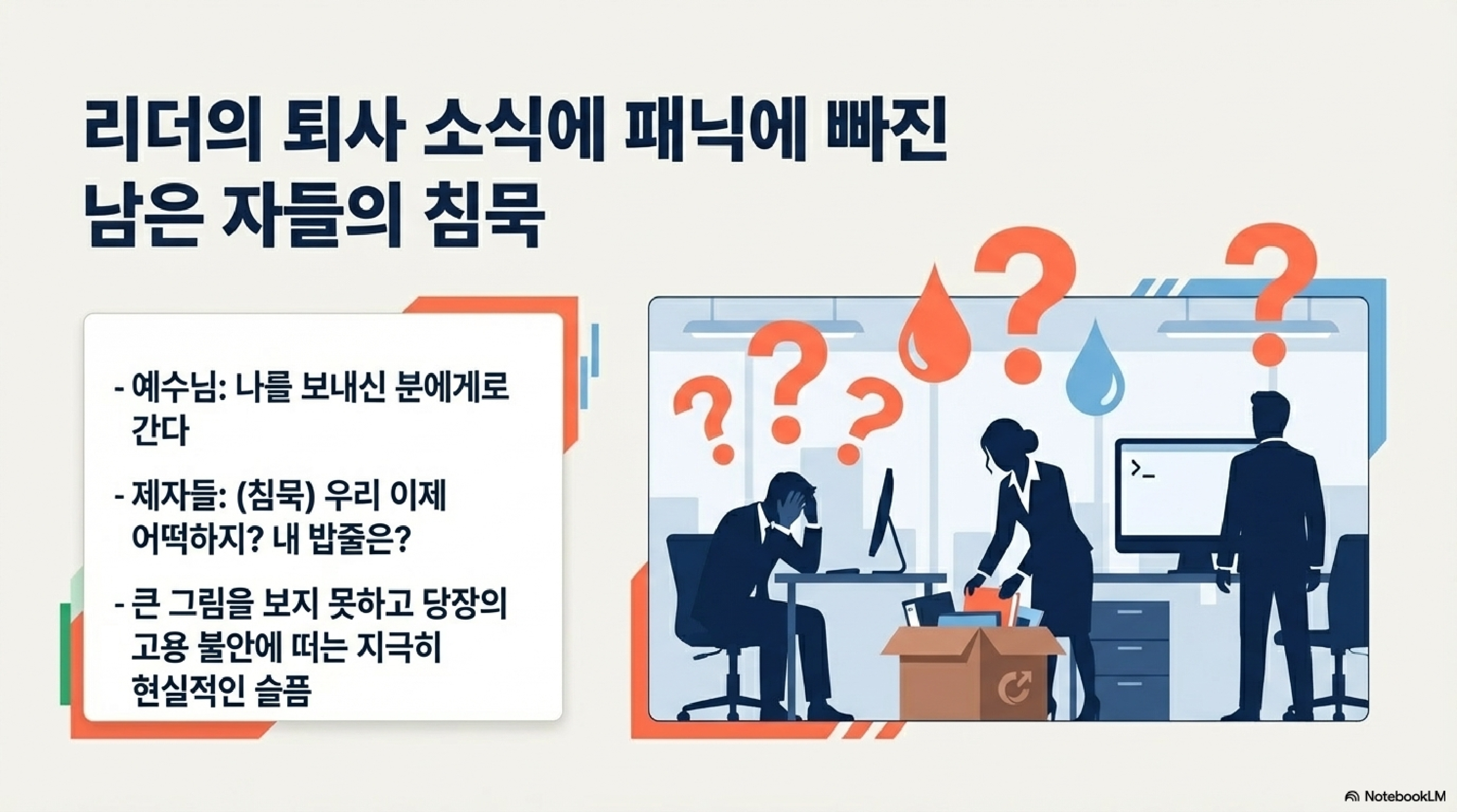 주식으로 치면 장 마감 직전에 갑자기 '거래 정지 및 상장 폐지 예고' 공시가 뜬 겁니다. 심지어 사람들이 너희를 죽이면서 "이게 다 하나님을 위한 일이다"라고 착각할 거라고 팩트 폭격을 날리시죠(v.2-3). 제자들 입장에서는 마른하늘에 날벼락이죠. 마음속에 슬픔이 가득 찰 수밖에 없습니다(v.6).